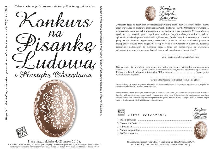 Jak co roku Miejski Ośrodek Kultury organizuje konkurs na najpiękniejszą pisankę ludową, prace należy składać w siedzibie MOK do 21 marca, wystawa pokonkursowa czynna będzie w dniach 22 - 25 marca.