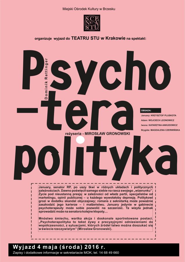 MOK po raz kolejny organizuje wyjazd dla miłośników teatru. 4 maja w Teatrze Stu odbędzie się spektakl „Psychoterapolityka” - doskonała komedia ze znakomitą obsadą. Zapisy i dodatkowe informacje w sekretariacie MOK lub pod numerem telefonu: 14 68 49 660.