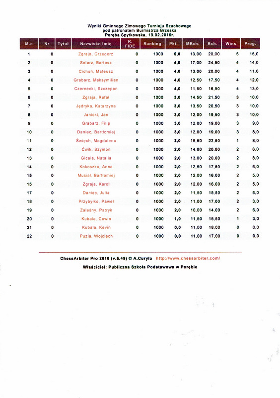W Publicznej Szkole Podstawowej w Porębie Spytkowskiej odbył się Gminny Turniej Szachowy szkół podstawowych „Zima 2016”. Jak co roku jego organizatorem był dyrektor szkoły Piotr Tota. Udział w nim wzięło 22 zawodników.Rozgrywany był systemem szwajcarskim – kontrolowanym na dystansie 5 rund z tempem gry 15 minut dla zawodnika z obowiązującymi przepisami Kodeksu Szachowego.Zawody zdominowali uczniowie z Poręby Spytkowskiej. Pierwsze miejsce zajął Grzegorz Zgraja wyprzedzając Bartosza Solarza i Mateusza Cichonia. Również w kategorii dziewcząt najlepszymi okazały się uczennice tej szkoły: Katarzyna Jędryka, Magdalena Święch i Natalia Gicala.Najlepsi zawodnicy w kategorii dziewcząt i chłopców otrzymali puchary i dyplomy, uczniowie PSP Poręba Spytkowska zainkasowali punkty do rankingu szkolnego, a wśród wszystkich uczestników zostały rozlosowane dodatkowe atrakcyjne nagrody.Patronat nad zawodami sprawował burmistrz Brzeska Grzegorz Wawryka.
