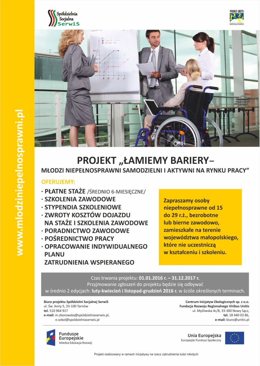 Spółdzielnia Socjalna Serwis w partnerstwie z Centrum Inicjatyw Ekologicznych i z Fundacją Rozwoju Regionalnego VIRIBUS UNITIS rozpoczyna realizację Projektu „Łamiemy Bariery - młodzi niepełnosprawni samodzielni i aktywni na rynku pracy" w ramach Programu Operacyjnego Wiedza Edukacja Rozwój 2014-2020 Priorytet I. Osoby młode na rynku pracy, Działanie 1.2 Wsparcie osób młodych pozostających bez pracy na regionalnym rynku pracy 1.2.2 Wsparcie udzielane z Inicjatywy na rzecz zatrudnienia ludzi młodych.Celem projektu jest aktywizacja zawodowa i podniesienie zdolności do podjęcia pracy u 70 osób niepełnosprawnych w wieku od 15 do 29 lat, biernych zawodowo i bezrobotnych, nieuczestniczących w formalnym kształceniu stacjonarnym i zamieszkujących na terenie województwa małopolskiego.Dla Uczestników przewidziano staże zawodowe, które będą trwały od 3 do 9 miesięcy. Za udział w stażu przewidziane jest stypendium stażowe w wysokości ok. 1280 zł brutto/mc. Dodatkowo Uczestnikom Projektu zostaną zwrócone koszty dojazdu na staże i szkolenia, które będą odbywać się poza miejscem zamieszkania. Pracodawcy przyjmujący stażystów nie będą ponosić żadnych kosztów zatrudnienia, a w dodatku sami zdecydują o wyborze odpowiedniej osoby.W ramach Projektu Uczestnicy zostaną objęci: indywidualnym planem działania, poradnictwem zawodowym, pośrednictwem pracy oraz opieką trenera zatrudnienia wspieranego. Mogą również skorzystać z oferty szkoleniowej dostosowanej do indywidualnych potrzeb i możliwości Uczestników Projektu oraz potrzeb lokalnego rynku pracy. Szkolenia będą kończyć się egzaminem i uzyskaniem certyfikatu potwierdzającego uzyskane kwalifikacje lub uzyskaniem uprawnień do wykonywania zawodu unormowanych w rozporządzeniach właściwego ministra.Kompleksowe wsparcie ma na celu aktywizację zawodową osób niepełnosprawnych i wprowadzenie ich na rynek pracy. Pozwoli im na zdobycie cennego doświadczenia zawodowego i nabycie niezbędnych kompetencji.Rekrutacja prowadzona będzie w biurze Projektu Spółdzielni Socjalnej SerwiS 3-4.03.2016r., ul. Św. Anny 5, 33-100 Tarnów.Szczegółowe informacje oraz kontakt w sprawie Projektu: Spółdzielnia Socjalna SerwiS ul. Krakowska 13, 33-100 TarnówTel. 510 964 917m.zborowska@spoldzielniaserwis.plle.sokol@spoldzielniaserwis.plwww.mlodziniepelnosprawni.pl