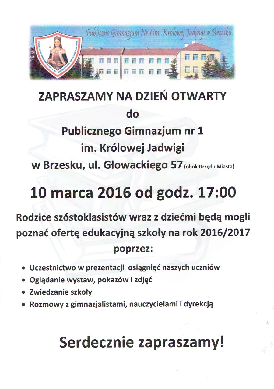 Dyrekcja Publicznego Gimnazjum Nr 1 im. Królowej Jadwigi w Brzesku zaprasza na dzień otwarty szkoły w dniu 10 marca.Uczniowie wraz z wychowawcami od godz. 9.45 wezmą udział w prezentacji osiągnięć szkoły, lekcjach otwartych, grze szkolnej, zapoznają się z bazą szkoły, oraz poznają ofertę edukacyjną na rok szkolny 2016/2017.W godzinach popołudniowych od 17.00 rodzice wraz z dziećmi będą mogli poznać ofertę edukacyjną na rok 2016/2017 poprzez uczestnictwo w prezentacji osiągnięć uczniów, oglądanie wystaw, pokazów i zdjęć połączone z rozmowami z gimnazjalistami, nauczycielami i dyrekcją.Dyrekcja szkoły oraz grono pedagogiczne serdecznie zapraszają.