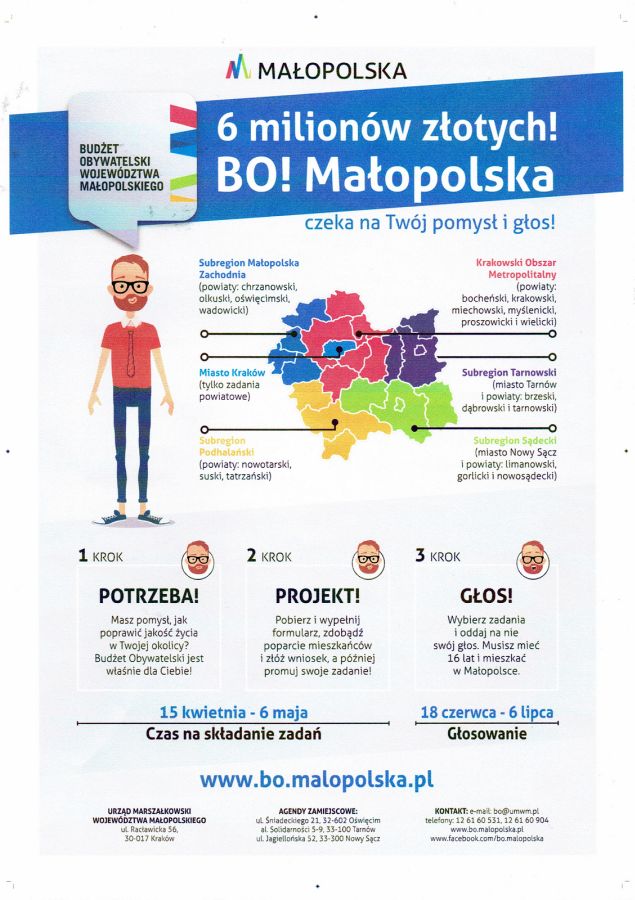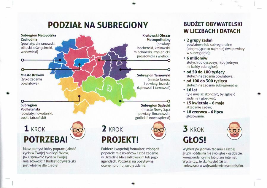 Budżet obywatelski to w sumie 6 mln zł – po 1 mln zł dla każdego subregionu! Zgłoszenia od 16 kwietnia! Szczegóły na dołączonych plakatach.