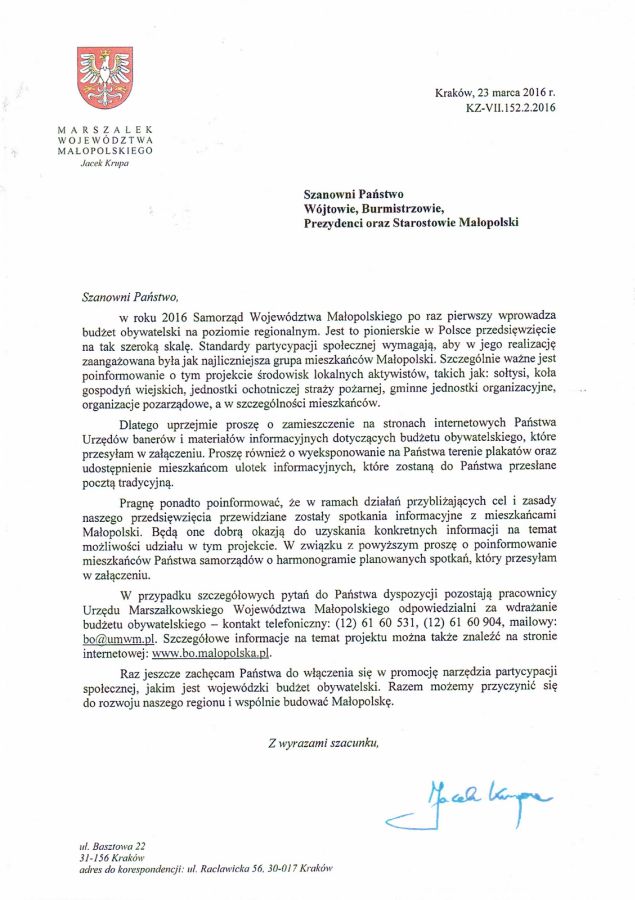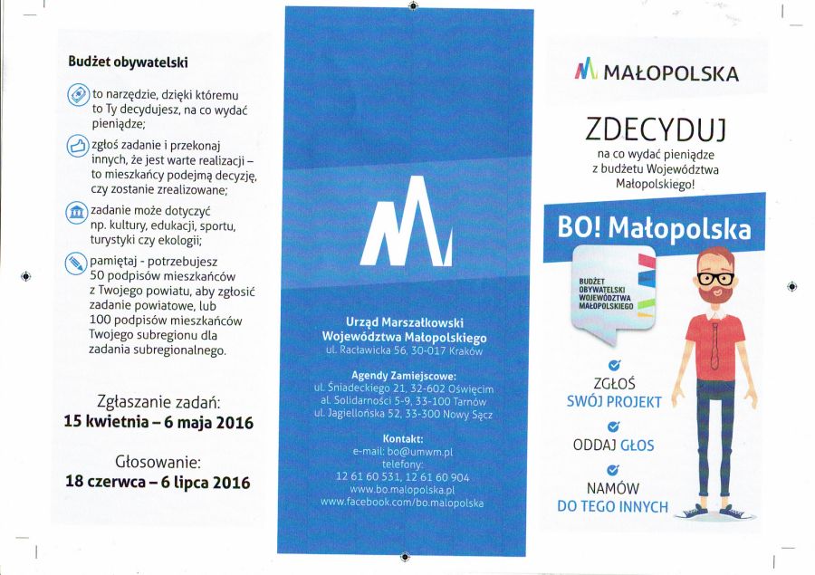 Budżet obywatelski województwa pozwala mieszkańcom Małopolski kształtować ich najbliższe otoczenie, umożliwia określenie potrzeb, daje możliwość wskazania co jest dla nich szczególnie ważne. Dzięki niemu mieszkańcy określają priorytety dla rozwoju powiatów, subregionów oraz całej Małopolski.