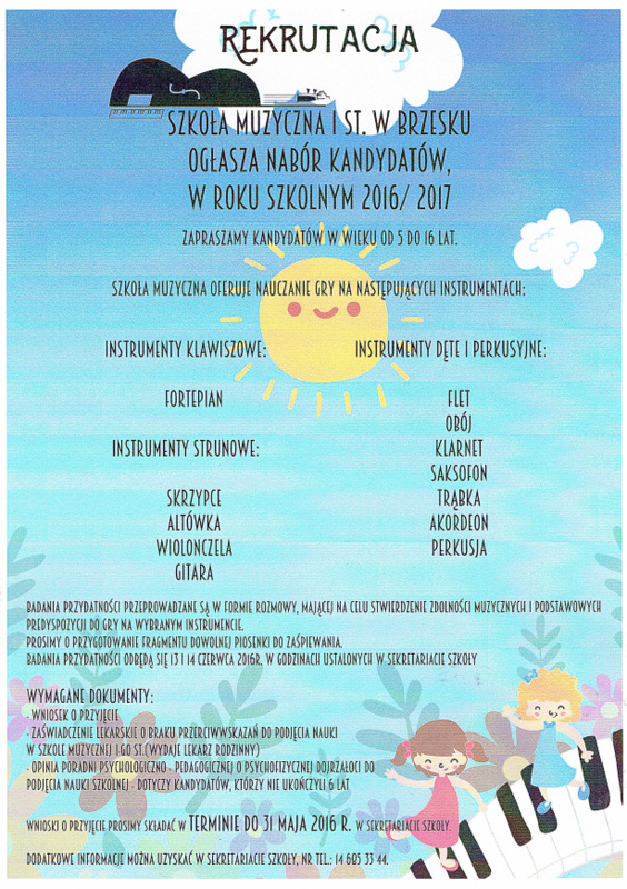 Szkoła Muzyczna I Stopnia w Brzesku ogłasza nabór kandydatów w roku szkolnym 2016/2017 dla kandydatów w wieku od 5 do 16 lat.Oferuje nauczanie gry na następujących instrumentach:Klawiszowe: fortepianStrunowe: skrzypce, altówka, wiolonczela, gitaraDęte i perkusyjne: flet, obój, klarnet, saksofon, trąbka, akordeon, perkusjaBadania przydatności prowadzone są w formie rozmowy w celu stwierdzenia zdolności muzycznych i podstawowych predyspozycji do gry na wybranych instrumentach.Badania odbędą się 13 i 14 czerwca 2016 r. w godzinach ustalonych w sekretariacie szkoły.Wnioski o przyjęcie prosimy składać w terminie do 31 maja w sekretariacie szkoły.Dodatkowe informacje można uzyskać w sekretariacie szkoły tel: (14) 685 33 44
