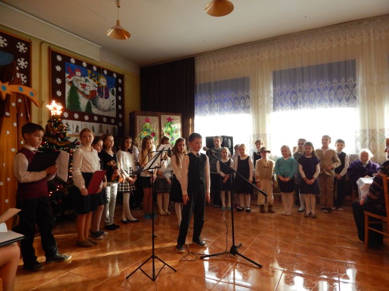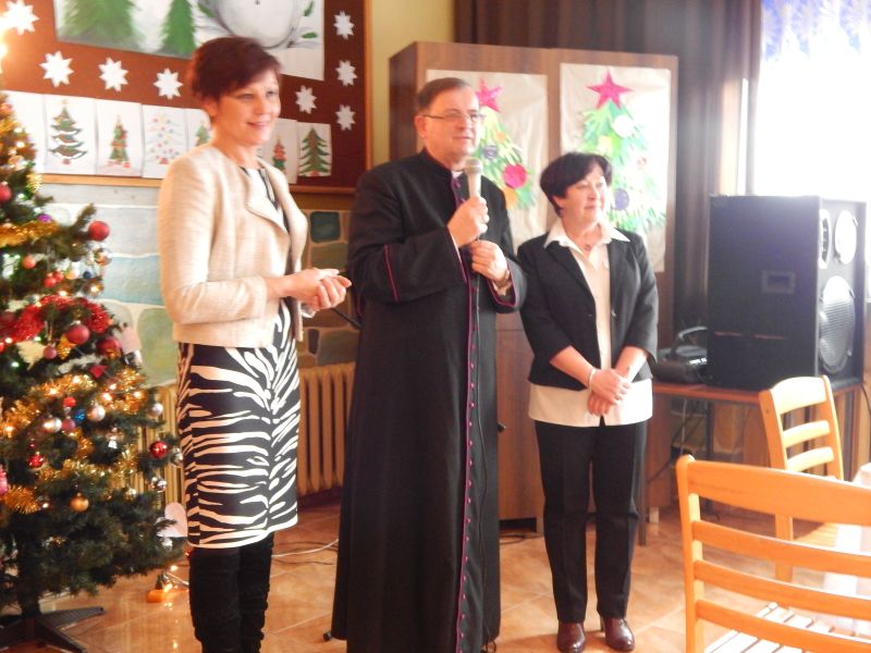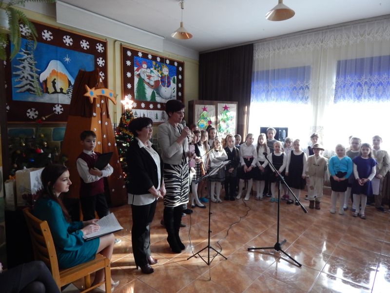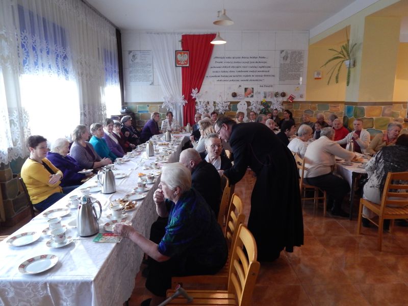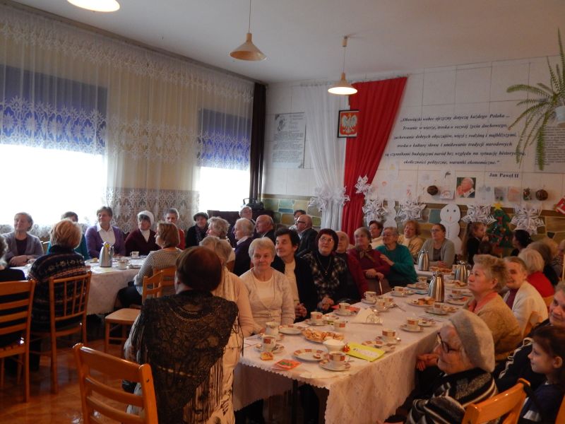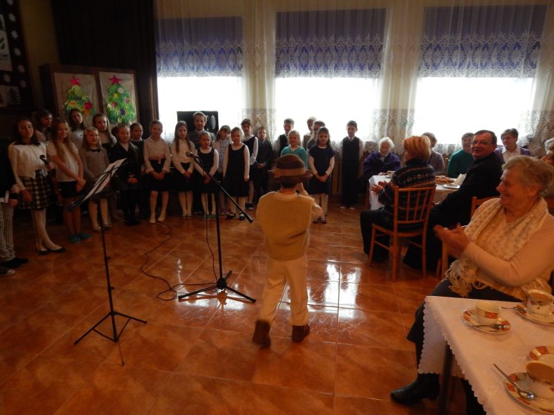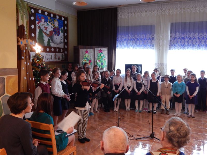 Grupa blisko pięćdziesięciu osób mogła obejrzeć wspaniały program artystyczny, który zaprezentowała grupa dzieci z naszej szkoły. Uczennice szkoły muzycznej, zapewne przyszła altowiolistka Weronika Klich i skrzypaczka Honoratka Oleksyk zaprezentowały umiejętności gry odpowiednio na altówce i skrzypcach. Uczestnicy spotkania nagrodzili małych artystów gromkimi brawami, a dzieci obdarowały każdego przygotowanymi własnoręcznie przepięknymi świątecznymi laurkami. W spotkaniu uczestniczył ks. proboszcz Władysław Pasiut, kierując do zgromadzonych życzliwe słowa i poświęcając każdemu z uczestników chwile rozmowy. Wspólne kolędowanie, opowieści, wspomnienia wypełniły czas tego wyjątkowego spotkania, które było odpowiedzią na często podnoszoną przez grupę starszych mieszkańców potrzebę kontaktu z rówieśnikami.