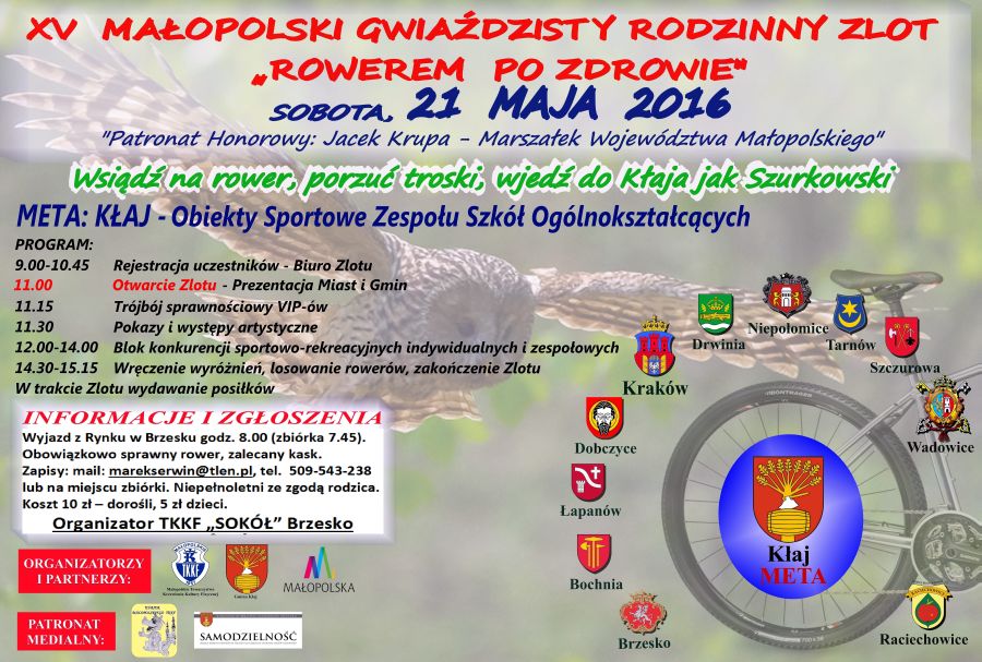 „Wsiądź na rower, porzuć troski, wjedź do Kłaja jak Szurkowski”. TKKF „SOKÓŁ” Brzesko, Małopolskie TKKF oraz Gmina Kłaj zapraszają sympatyków kolarstwa do udziału w Małopolskim Gwiaździstym Rodzinnym Zlocie Rowerowym „Rowerem po zdrowie”, który odbędzie się w sobotę 21 maja 2016 r. Długość trasy Brzesko – Kłaj – Brzesko to ok. 60 km.Zlot objęty został honorowym patronatem Marszałka Województwa Małopolskiego Jacka Krupy. Na miejscu Zlotu w Kłaju planowane są liczne konkurencje sportowe.Każdy z uczestników Zlotu bierze udział w losowaniu roweru ufundowanego przez Urząd Miejski w Brzesku.Wyjazd z Rynku w Brzesku godz. 8.00 (zbiórka 7.45). Planowany powrót godz. 18.00. Uczestnicy powinni posiadać kask kolarski. Niepełnoletni wyłącznie ze zgodą rodzica/opiekuna.Koszt wyjazdu 10 zł dorośli, 5 zł dzieci (wyżywienie, zabezpieczenie techniczne, ubezpieczenie).Zgłoszenia mailowo do 20 maja 2016 r. na adres marekserwin@tlen.pl lub na miejscu zbiórki.Liczba miejsc ograniczona, decyduje kolejność zgłoszeń.ZarządTKKF „SOKÓŁ” BrzeskoR E G U L A M I N (projekt )XV Małopolskiego Rodzinnego Gwiaździstego Zlotu Rowerowego „Rowerem po zdrowie” - Kłaj 21 maja 2016 r. pod honorowym patronatem Jacka Krupy – Marszałka Województwa MałopolskiegoI. Cel imprezy :- promocja i ukazanie walorów turystyczno przyrodniczych Ziemi Małopolskiej przez którą przebiegają trasy Zlotu ze szczególnym uwzględnieniem Ziemi Bocheńskiej i Gminy Kłaj- popularyzacja rodzinnej turystyki rowerowej jako najprostszej i najskuteczniejszej formy aktywnego wypoczynku dostępnej dla każdego,- tworzenie wzorców zachowań w zakresie aktywności fizycznej oraz nawiązywanie związków między ruchem a zachowaniem człowieka,- promocja wartości zdrowotnych aktywności ruchowej- nawiązanie bliskich kontaktów, wymiana doświadczeń, integracja środowisk poprze uczestnictwo w rywalizacji sportowo-rekreacyjnej- promocja 59– letniego dorobku i działalności Towarzystwa Krzewienia Kultury Fizycznej.II. Termin i meta :- 21 maja 2016 roku / sobota / - KŁAJ w Gminie Kłaj- Biuro Zlotu - Obiekty sportowe Zespołu Szkół OgólnokształcącychIII. Organizator :- Małopolskie Towarzystwo Krzewienia Kultury Fizycznej – Zarząd Wojewódzki w Krakowie- Gmina KłajIV. Partnerzy i współorganizatorzy :- Województwo Małopolskie- Miasta i Gminy : Miasto Bochnia, M. Brzesko, G i M Dobczyce,G. Drwinia, G. Łapanów, MiG. Niepołomice, G. Raciechowice,G. Szczurowa,- Ogniska TKKF: Dobczyce, Wiarus - Niepołomice, Sokół - Brzesko,Leskowiec - Wadowice, Azoty - Tarnów, Apollo – Kraków,V. Wsparcie medialne :- Samodzielność – miesięcznik informacyjno-ogłoszeniowy- Kurier Małopolskiego TKKFVI. Komitet Honorowy :- Zofia Czupryna Honorowy Prezes Zarządu WojewódzkiegoMałopolskiego TKKF- Leszek Tytko Prezes Zarządu Wojewódzkiego Małopolskiego TKKF- Zbigniew Strączek Wójt Gminy Kłaj- Stefan Kolawiński Burmistrz Miasta Bochnia- Grzegorz Wawryka Burmistrz Miasta Brzesko- Paweł Machnicki Burmistrz Gminy i Miasta Dobczyce- Jan Pająk Wójt Gminy Drwinia- Robert Roj Wójt Gminy Łapanów- Roman Ptak Burmistrz Miasta i Gminy Niepołomice- Marek Gabzdyl Wójt Gminy Raciechowice- Marian Zalewski Wójt Gminy SzczurowaVII. Komitet Organizacyjny :- Małgorzata Balik Gmina Kłaj – Przewodnicząca Komitetu- Karol Oleksy Komandor Zlotu – Wiceprezes ZarząduWojewódzkiego Małopolskiego TKKF- Lucyna Dudziak Gmina Kłaj – Dyr. Zespołu SzkółOgólnokształcących- Wojciech Wilk Gmina Kłaj- Dorota Błonierczyk Miasto Bochnia- Maciej Piątek Miasto Bochnia- Marek Serwin Miasto Brzesko- Iwona Kania Gmina i Miasto Dobczyce- Wiktor Piwowarski Gmina i Miasto Dobczyce – Prezes TKKF Dobczyce- Radosław Brydniak Gmina Drwinia- Michał Rudnik Gmina Drwinia- Tadeusz Mazur Gmina Łapanów- Leon Pitucha Miasto i Gmina Niepołomice – Prezes TKKF„ Wiarus „ Niepołomice- Jerzy Turek Miasto i Gmina Niepołomice- Halina Zając Gmina Raciechowice- Elżbieta Gądek Gmina Szczurowa- Katarzyna Biedrońska Gmina Szczurowa- Halina Kulbacka Prezes TKKF „ Leskowiec „ Wadowice- Józef Szczepanek Prezes TKKF „ Azoty „ TarnówVIII. Ramowy program :- godz. 9;00 - 10;45 Biuro Zlotu - rejestracja uczestników.-- godz. 10,00 – 13,00 Wydawanie posiłków- godz. 11;00 Otwarcie Zlotu – Prezentacja Miast i Gmin- godz. 11;15 Trójbój sprawnościowy VIP-ów o puchar Prezesa ZW MTKKF- godz. 11;30 Pokazy i występy artystyczne- godz. 12;00 – 14;00 Blok konkurencji sportowo rekreacyjnych indywidualnych izespołowych- godz. 14;30 Wręczenie wyróżnień, losowanie rowerów. zakończenie Zlotu- godz. 15;15 Zamknięcie ZlotuIX. Trasy dojazdowe :Trasy dojazdowe grup zorganizowanych i uczestników indywidualnych są dowolne.W miejscowości Kłaj dojazd na metę Zlotu będzie odpowiednio oznakowany.X. Zasady uczestnictwa :1.W Zlocie uczestniczą : dzieci, młodzież i dorośli w grupach zorganizowanych lubindywidualnie.a/ udział dzieci , młodzieży i osób dorosłych w grupach zorganizowanych orazich opiekunów zgłoszonych do współorganizatorów ( miast i gmin ) jest bezpłatnyb/ osoby uczestniczące w Zlocie indywidualnie, nie zgłoszone do współorganizatorów –miast i gmin wpłacają wpisowe w wysokości :- osoby dorosłe 10 zł- dzieci i młodzież 5 zł2. Obowiązkiem dzieci i młodzieży do lat 18 uczestniczących w Zlocie indywidualnie jestposiadanie karty rowerowej , kasku rowerowego oraz dostarczenie pisemnegooświadczenia – zgody obojga rodziców lub opiekuna prawnego na załączonymformularzu.3. Obowiązkiem współorganizatora ( miasta i gminy ) na każdej trasie dojazdowej domety Zlotu jest zapewnienie grupom zorganizowanym opieki medyczneji technicznej zarówno na trasie przejazdu jak i w czasie pobytu na miejscuZlotu.4.Wszystkich uczestników Zlotu obowiązuje przestrzeganie przepisów KodeksuDrogowego oraz poleceń organizatorów i służb porządkowych.5.