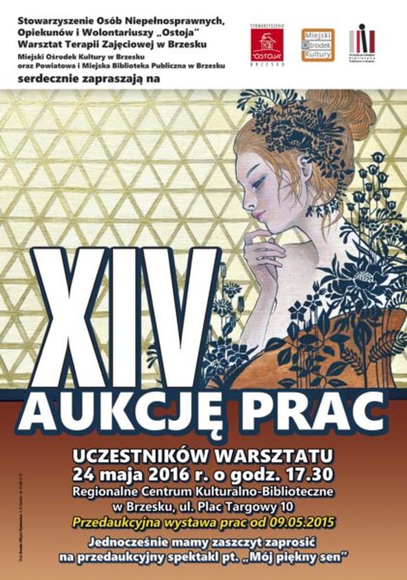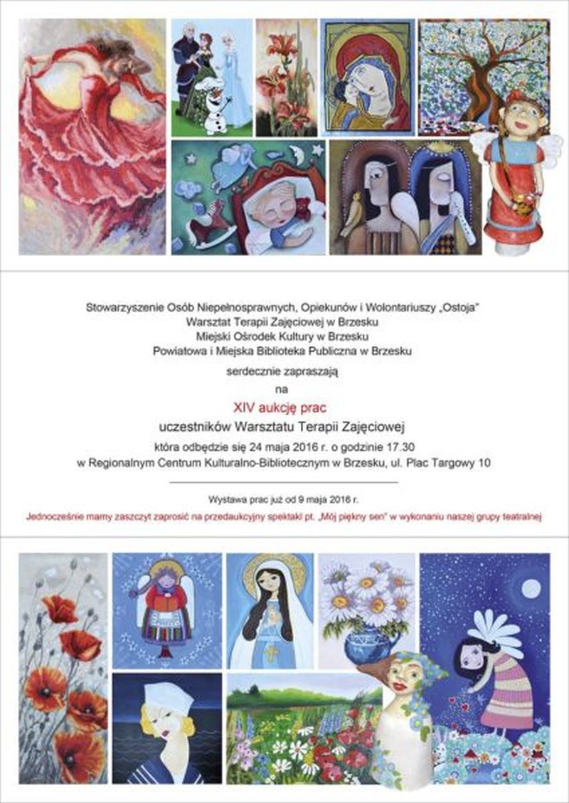 Stowarzyszenie Osób Niepełnosprawnych, Opiekunów i Wolontariuszy „Ostoja”, Warsztat Terapii Zajęciowej w Brzesku, Miejski Ośrodek Kultury oraz Powiatowa i Miejska Biblioteka Publiczna w Brzesku serdecznie zapraszają na XIV aukcję prac uczestników Warsztatu Terapii Zajęciowej, która odbędzie się 24 maja 2016 r. o godz.17.30 w Regionalnym Centrum Kulturalno – Bibliotecznym w Brzesku. Wystawa trwa już od 9 maja w centrum bibliotecznym. Jednocześnie mamy zaszczyt zaprosić na przededukacyjny spektakl pt. „Mój piękny sen” w wykonaniu grupy teatralnej WTZ.