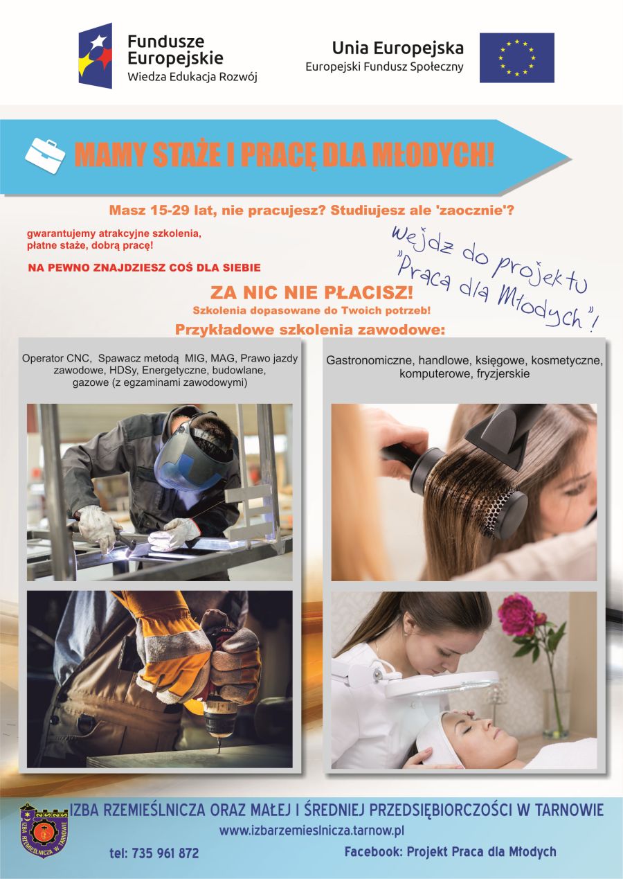 Izba Rzemieślnicza oraz Małej i Średniej Przedsiębiorczości w Tarnowie rozpoczyna realizację projektu „Praca dla Młodych”. Jej celem jest poprawa sytuacji młodych w wieku 15-29 lat na rynku pracy poprzez aktywizację społeczną i zawodową. W ramach projektu organizowane są szkolenia zawodowe dostosowane indywidualnie do potrzeb każdego uczestnika, które kończą się egzaminami dającymi uprawnienia do wykonywania zawodu np. operator CNC, operator koparki, wózka widłowego.
