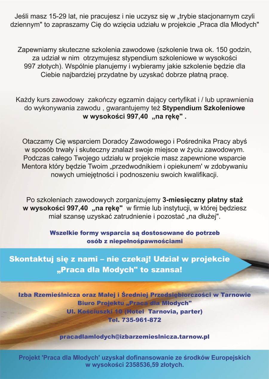 Wszelkie formy wsparcia uczestnika projektu są bezpłatne. Szczególnie zachęcamy osoby z niepełnosprawnościami do wzięcia udziału w projekcie. Zachęcamy do zapoznania się ze szczegółami na stronie: http://izbarzemieslnicza.tarnow.pl/projekty-europejskie/przaca-dla-mlodychZespół projektowy:Biuro Projektu „Praca dla Młodych”33-100 Tarnów, ul. Kościuszki 10Tel: 735 961 872
