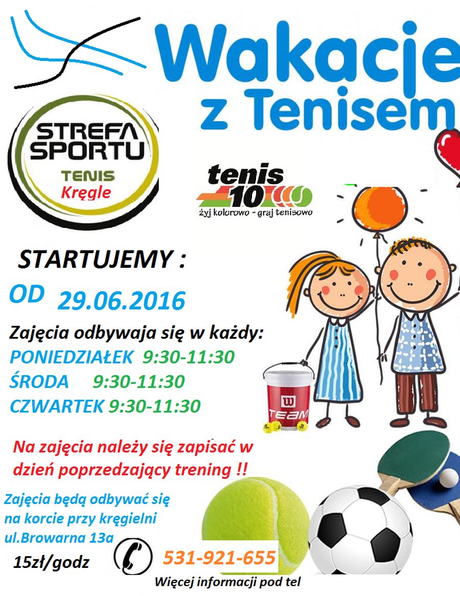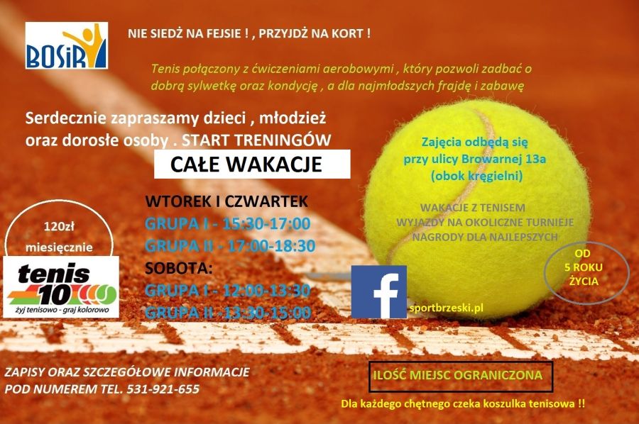 Nie siedź na fejsie - przyjdź na kort. Serdecznie zapraszamy dzieci, młodzież i osoby dorosłe do udziału w treningach tenisowych. Zajęcia odbywać się będą na korcie tenisowym BOSiR przy ul. Browarnej 13, obok kręgielni przez całe wakacje. Zapisy i szczegółowe informacje pod numerem tel. 531 921 655. Ilość miejsc ograniczona.