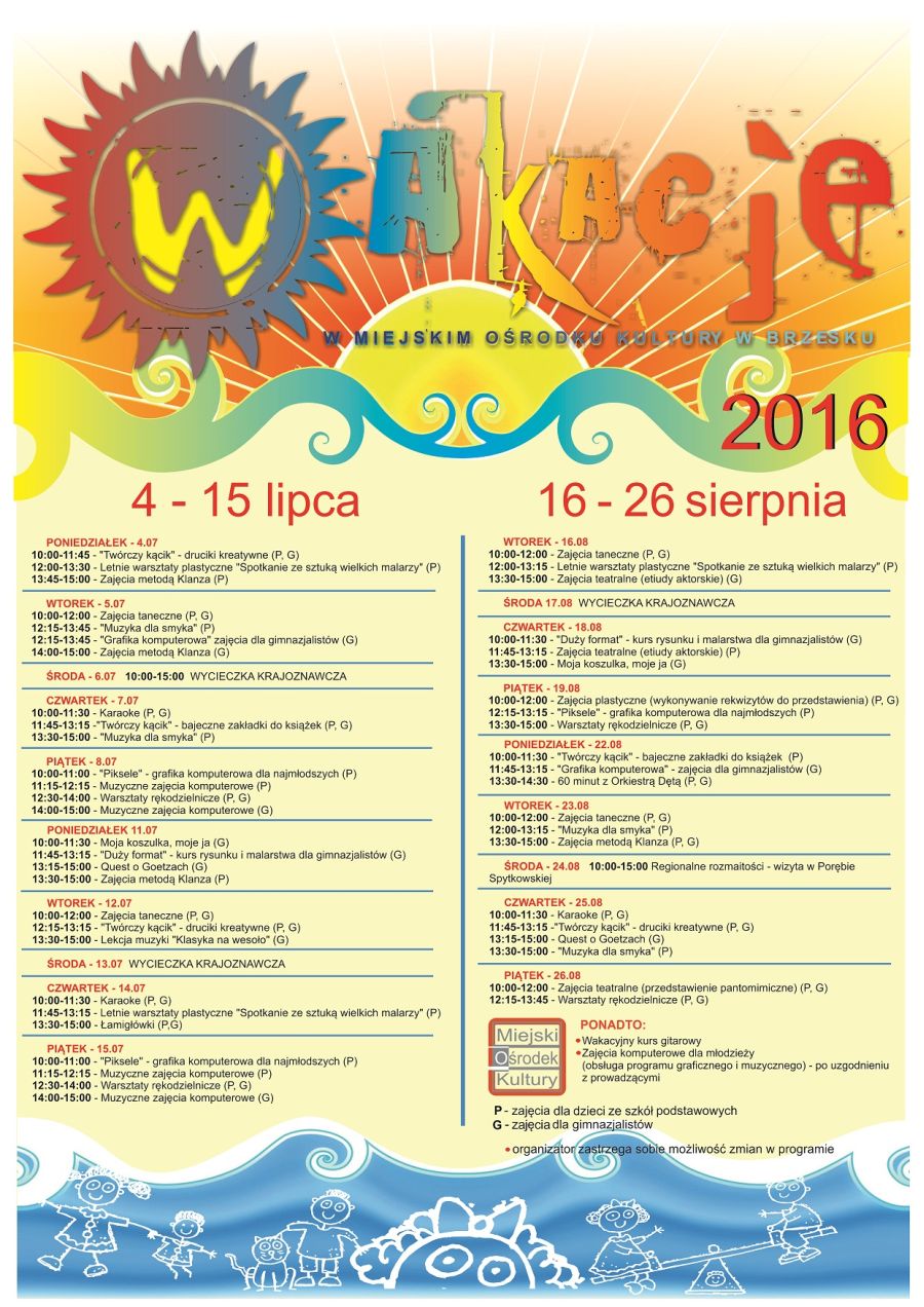 Od 4 lipca w Miejskim Ośrodku Kultury w Brzesku odbywają się zajęcia wakacyjne dla dzieci i młodzieży. Z myślą o nich przygotowana została bogata i ciekawa oferta spędzenia wolnego czasu. Zajęcia potrwają do 15 lipca. Kolejny cykl wakacyjnych spotkań, atrakcyjnych warsztatów i wycieczek rozpocznie się 16 sierpnia. Szczegóły na załączonym plakacie i stronie internetowej MOK www.mok.brzesko.pl
