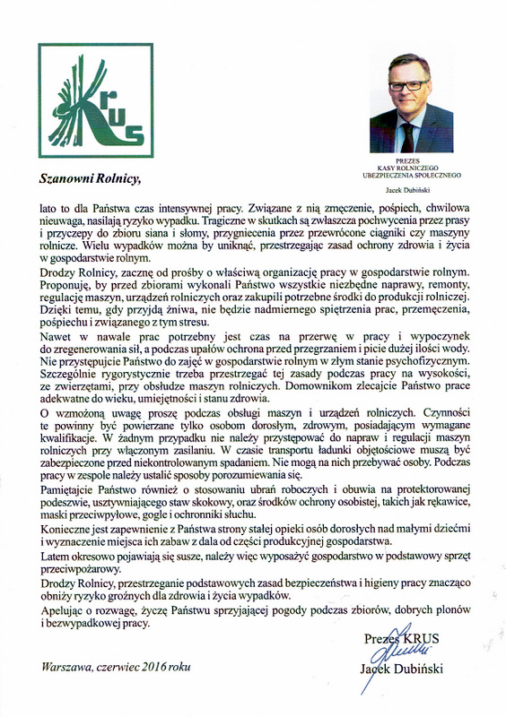 Kasa Rolniczego Ubezpieczenia Społecznego mając na uwadze bezpieczeństwo, ochronę zdrowia i życia rolników podczas intensywnych prac w okresie letnim apeluje o rozwagę, przestrzeganie podstawowych zasad bezpieczeństwa i higieny pracy, które mogą znacząco obniżyć ryzyko groźnych dla zdrowia i życia wypadków.