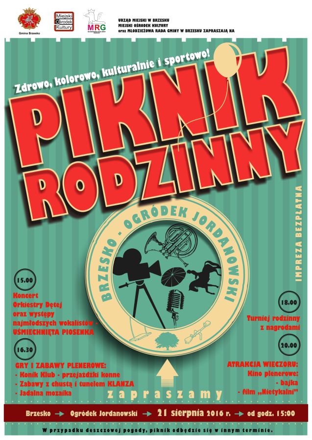 Urząd Miejski, Młodzieżowa Rada Gminy oraz Miejski Ośrodek Kultury zapraszają na piknik rodzinny, który w najbliższą niedzielę odbędzie się w Ogrodzie Jordanowskim.Początek imprezy zaplanowano na godzinę 15.00, kiedy odbędzie się koncert orkiestry dętej oraz występy dzieci. W programie są zabawy dla dzieci oraz turniej rodzinny z nagrodami. Atrakcją wieczoru będzie kino plenerowe, dla dzieci wyświetlona zostanie bajka, dla dorosłych zaś film „Nietykalni”.