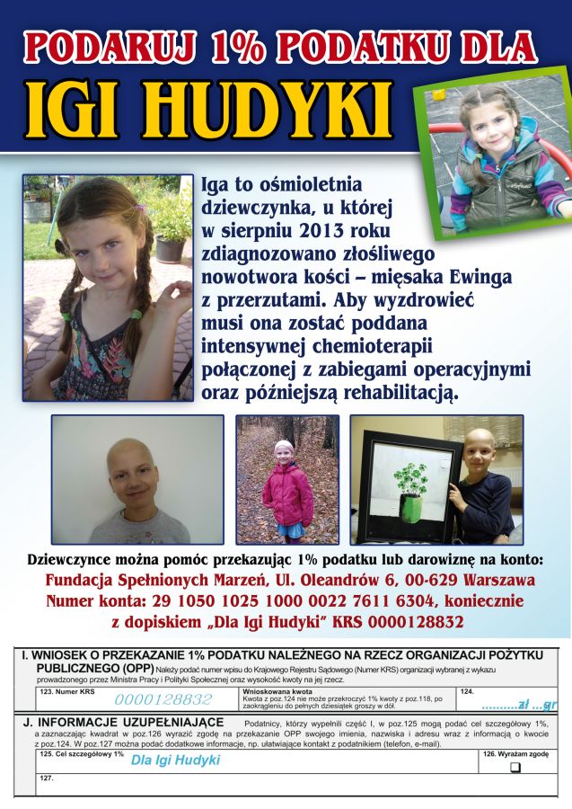 Iga i Milosz to dzieci, które potrzebują naszej pomocy. Możemy wspomóc ich wpłacając datki na podane numery kąt, można także przekazać im swój 1 procent podatku, dla chorych dzieci i ich rodziców liczy się każda złotówka.