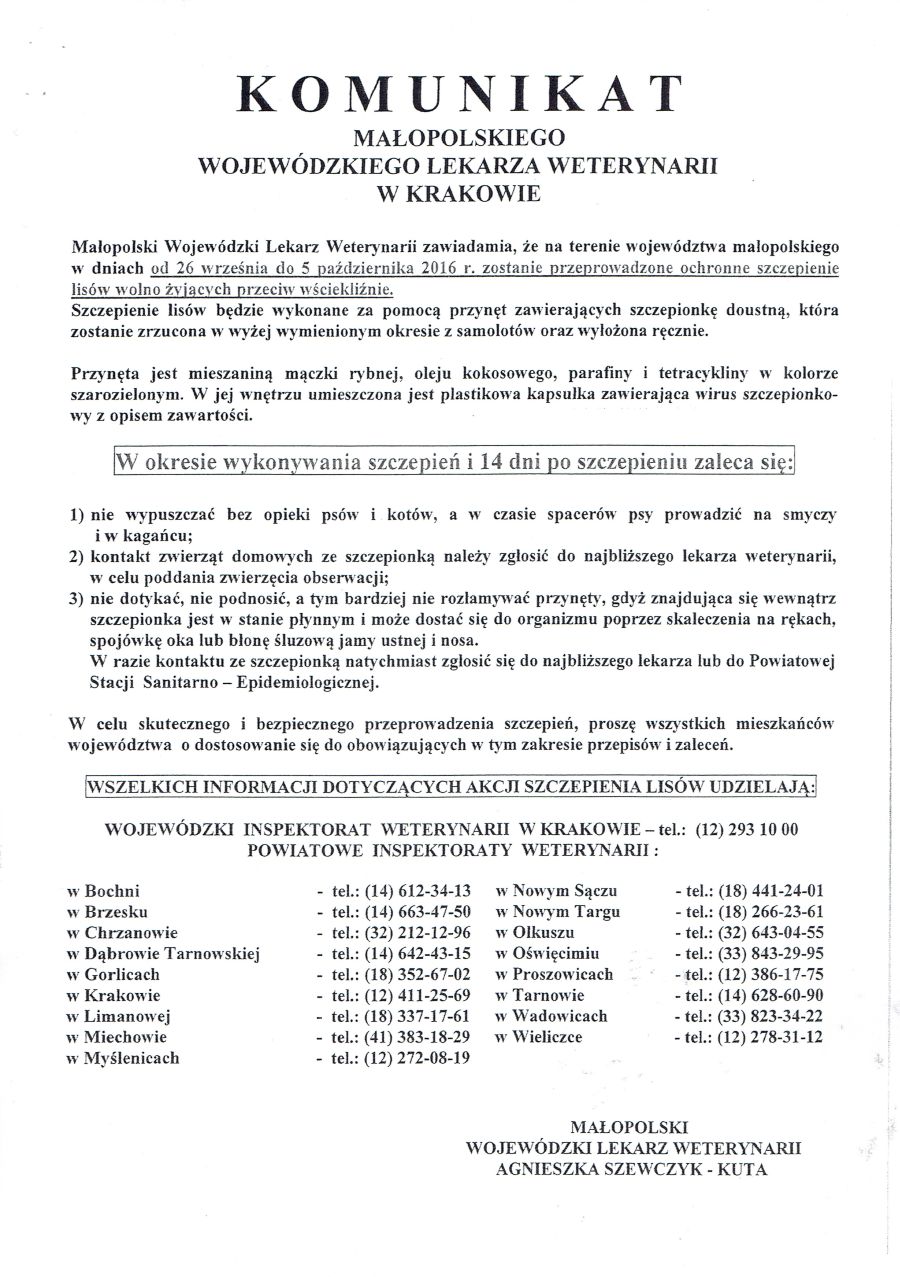 Małopolski Wojewódzki Lekarz Weterynarii zawiadamia, że na terenie województwa małopolskiego w dniach od 26 września do 5 października 2016 r. zostanie przeprowadzone ochronne szczepienie lisów wolno żyjących przeciw wściekliźnie.