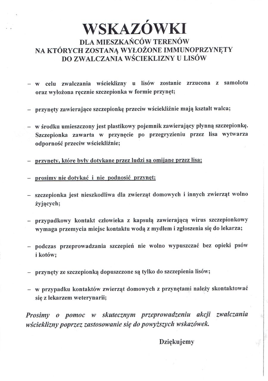 Wszelkich informacji dotyczących szczepienia lisów udziela Wojewódzki Inspektorat Weterynarii w Krakowie tel: (12) 293 10 00, a na terenie powiatu brzeskiego Inspektorat Powiatowy tel: (14) 663 47 50
