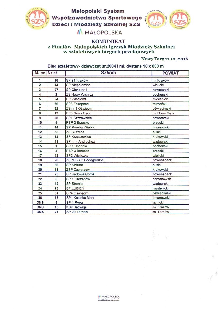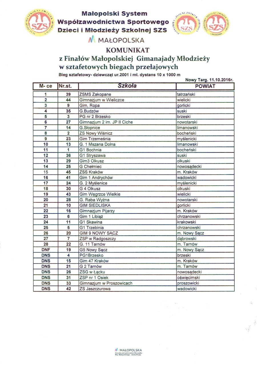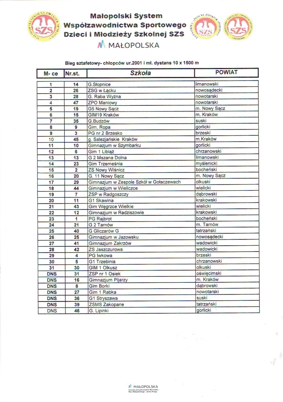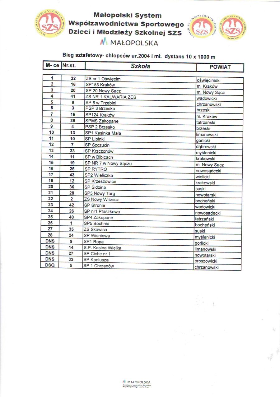 Droga do finałuZawody gminne w Sztafetowych Biegach Przełajowych Szkół Podstawowych i GimnazjówOrganizatorem zawodów był Wydział Edukacji Kultury i Sportu Urzędu Miejskiego w Brzesku. W imprezie wzięło udział 160 dzieci i młodzieży reprezentujących szkoły gminne.Szkoły Podstawowe- dziewczęta (10 x 800m)1. PSP Nr 2 Brzesko2. PSP Nr 3 Brzesko3. PSP Poręba Spytkowska4. PSP NR 1 Jadowniki5. PSP Jasień- chłopcy (10 x 1000m)1. PSP Nr 3 Brzesko2. PSP Nr 2 Brzesko3. PSP Jasień4. PSP Poręba Spytkowska5. PSP Jadowniki6. PSP OkocimGimnazja- dziewczęta (10 x 1000)1. PG Nr 2 Brzesko2. PG Nr 1 Brzesko3. PG Jadowniki- chłopcy (10 x 1500)1. PG Nr 2 Brzesko2. PG JadownikiDo zawodów powiatowych awansowały po dwa zespoły z każdej kategoriiZawody powiatowe w Sztafetowych Biegach Przełajowych w Czchowie.