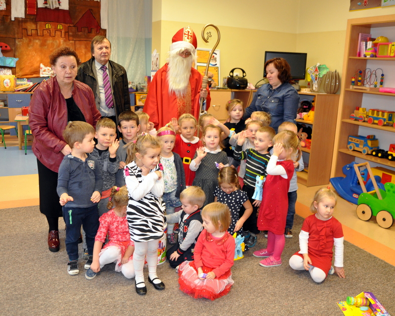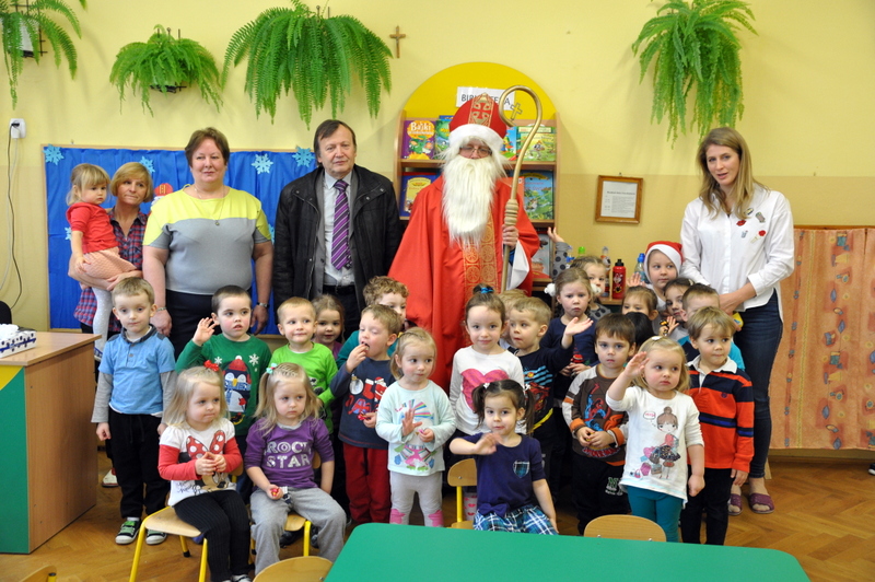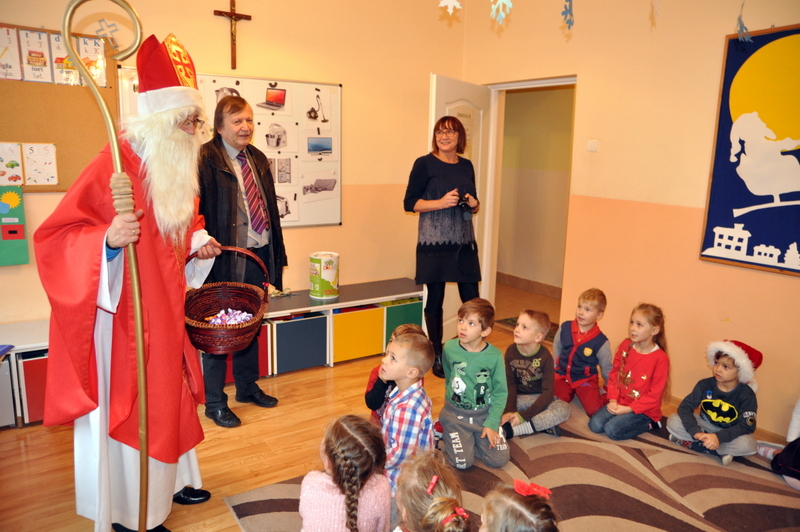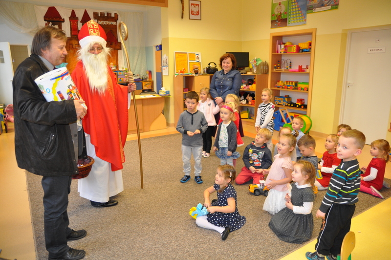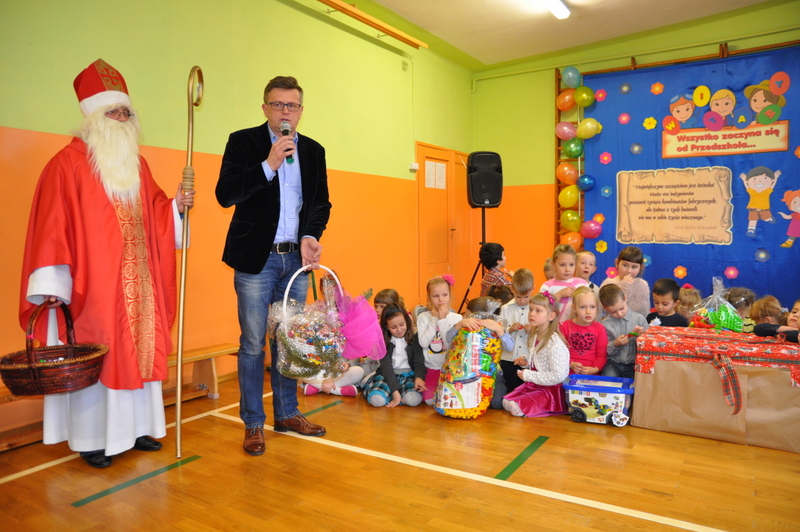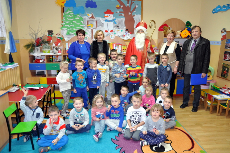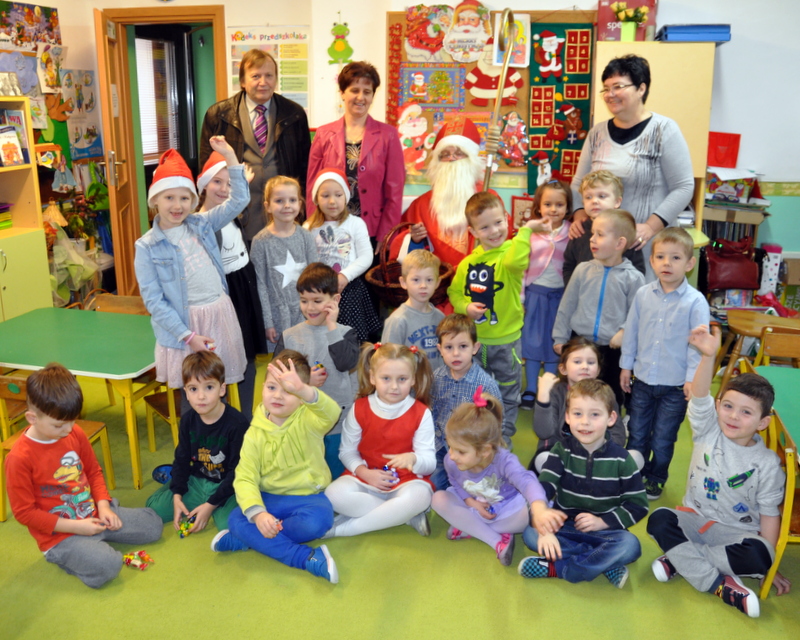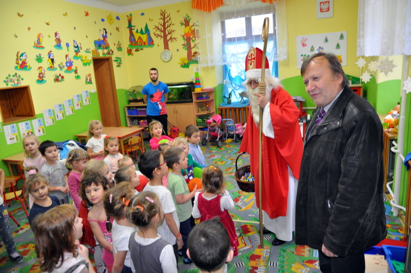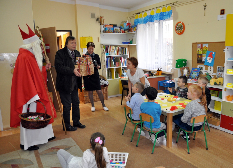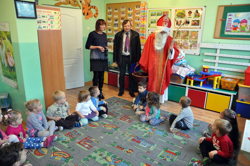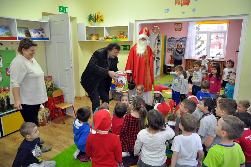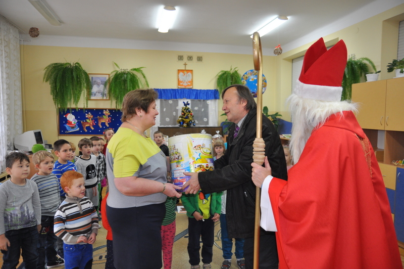 Burmistrz Grzegorz Wawryka przekazał przedszkolakom w prezencie mikołajowym okazale pudła i worki z zabawkami. Także radni przekazali nowootwartej placówce przedszkolnej prezenty.