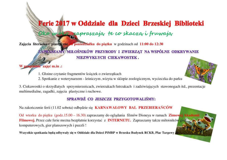 Równie atrakcyjnie zapowiadają się ferie w oddziale dla dzieci w bibliotece. Będą zajęcia literacko-plastyczne, które odbywać się będą od poniedziałku do piątku w godzinach od 11:00 do 12:30. Biblioteka zaprasza miłośników przyrody i zwierząt na wspólne odkrywanie niezwykłych ciekawostek.W programie zajęć m.in. głośne czytanie fragmentów książek o zwierzętach, spotkanie z weterynarzem, leśniczym ,wizyta w sklepie zoologicznym, wycieczka do parku, ciekawostki o skrzydlatych sprzymierzeńcach, zwierzakach futrzakach i zadziwiających stawonogach – prezentacje multimedialne, zagadki, zajęcia plastyczne i ruchowe. Od wtorku do piątku (godz.15.00 – 16.30) będzie można oglądać filmy Disneya w ramach Zimowej Akademii Filmowej. Organizatorzy zapraszają także miłośników gier komputerowych, gier planszowych i puzzli. Na zakończenie ferii (11.02 sobota) odbędzie się karnawałowy bal przebierańców.