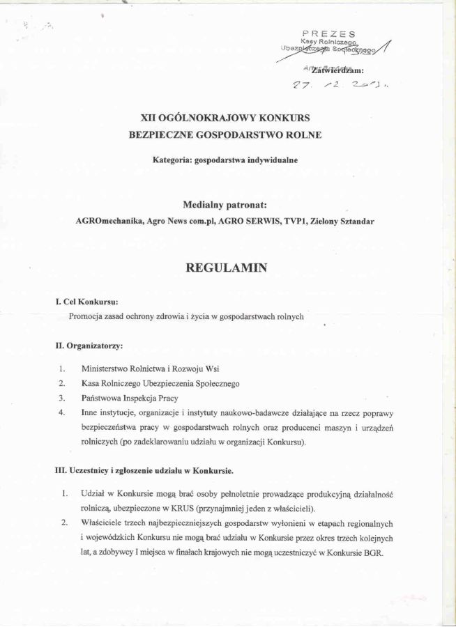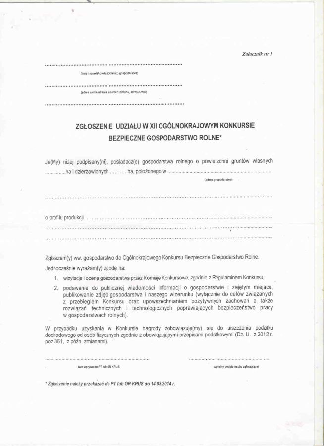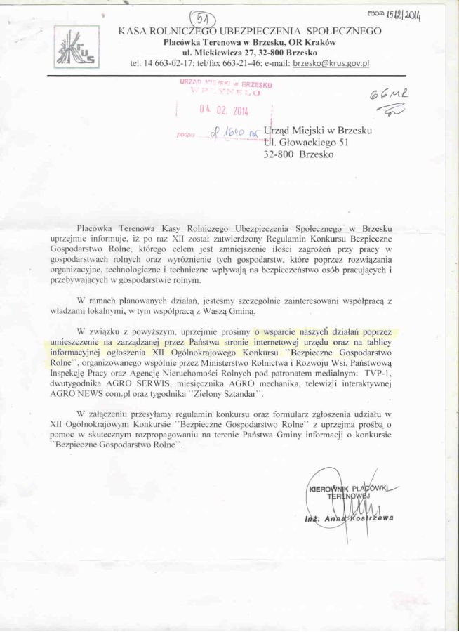 Kasa Rolniczych Ubezpieczeń Społecznych w Brzesku organizuje konkurs „Bezpieczne gospodarstwo rolne”, którego celem jest zmniejszenie zagrożeń przy pracy. Szczegóły w załącznikach.