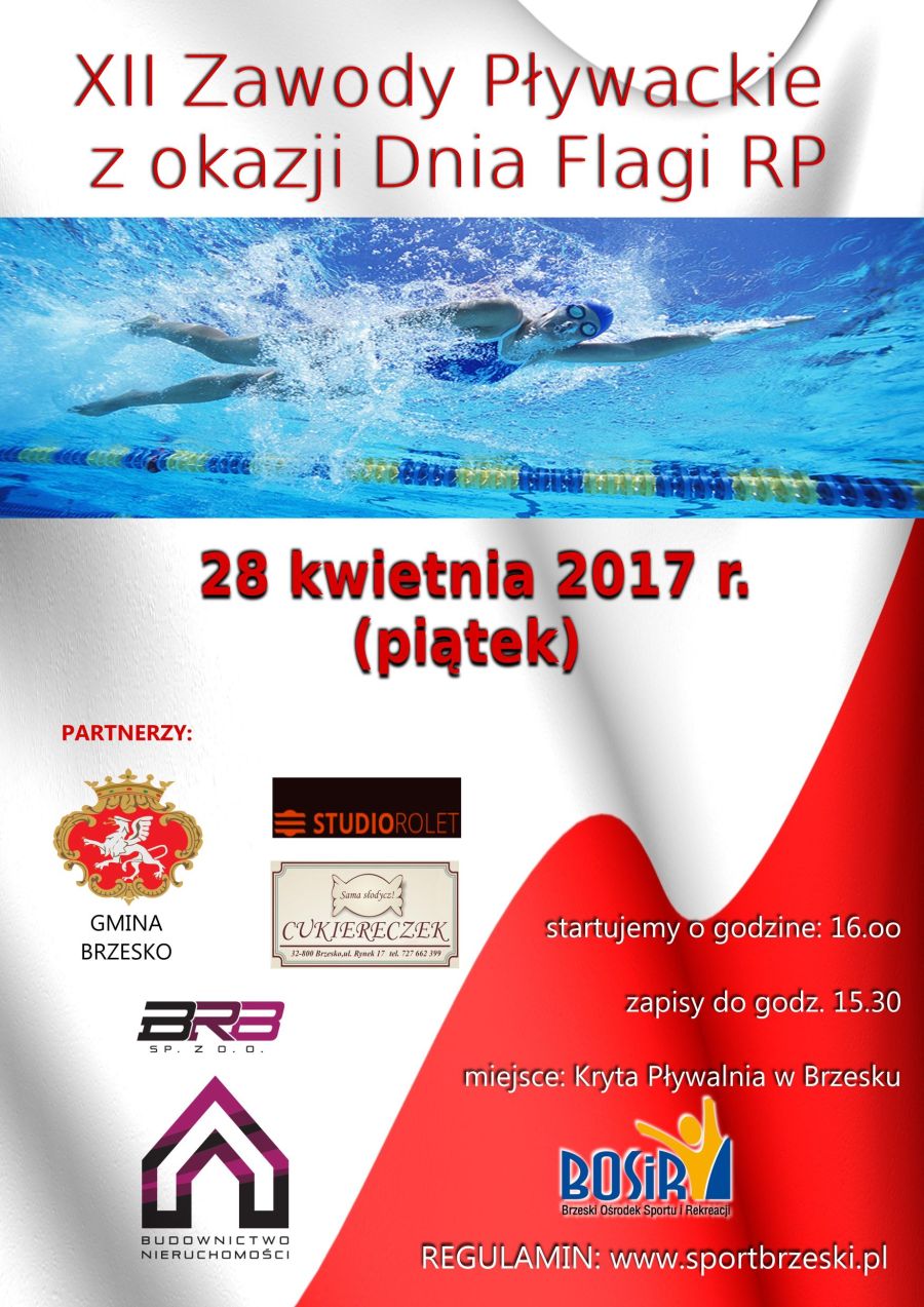 Serdecznie zapraszamy wszystkich miłośników pływania na XII Zawody Pływackie z okazji Dnia Flagi RP, które w tym roku odbędą się 28 kwietnia (piątek) o godz. 16.00. Organizatorem zawodów jest Brzeski Ośrodek Sportu i Rekreacji w Brzesku, a honorowy patronat objął Burmistrz Brzeska Grzegorz Wawryka.Zawody tradycyjnie zostaną rozegrane w dwóch stylach pływackich: dowolnym i klasycznym z podziałem na 16 kategorii wiekowych. Zapraszamy w szczególności najmłodszych pływaków do wspólnej zabawy i sportowej rywalizacji na brzeskiej pływalni. Dla najmłodszego i najmłodszej z uczestników przygotowaliśmy nagrody niespodzianki.Nasi partnerzy: