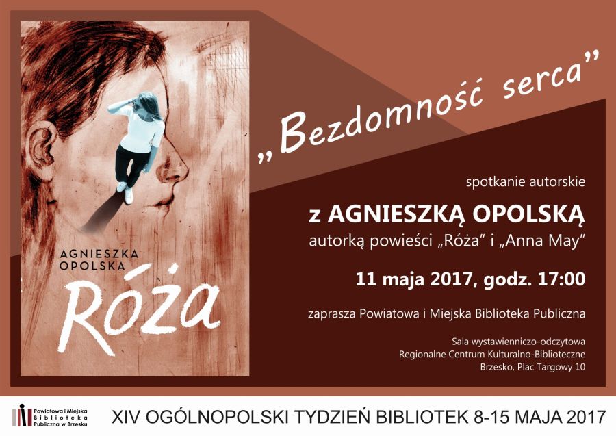 Powiatowa i Miejska Biblioteka Publiczna, w ramach Tygodnia Bibliotek organizuje spotkanie z Agnieszką Opolską - pisarką, autorką powieści "Róża" i "Anna May". Spotkanie odbędzie się dzisiaj 11 maja, o godzinie 17.00 w sali wystawienniczo-odczytowej w Regionalnym Centrum Kulturalno-Bibliotecznym.