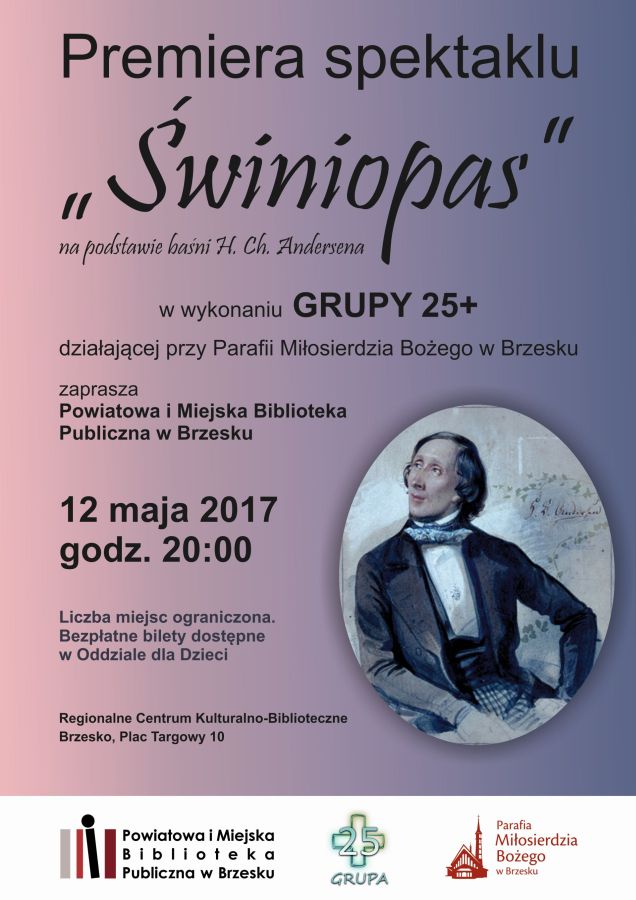 Jutro 12 maja, o godzinie 20.00 w sali widowiskowej w RCK-B odbędzie się spektakl "Świniopas" na podstawie baśni H. Ch. Andersena w wykonaniu Grupy 25+ działającej przy parafii Miłosierdzia Bożego. Wejście na spektakl bezpłatne.