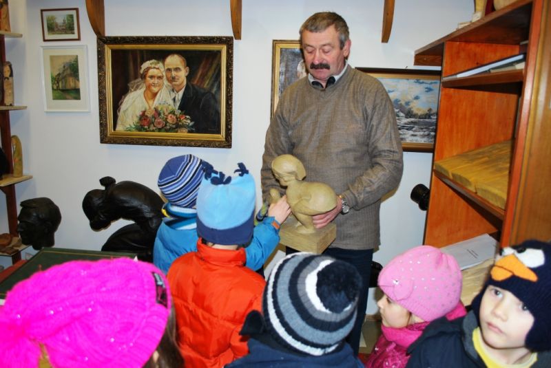 Dzieci obejrzały również stałą ekspozycję rzeźby: artystycznej, ludowej, znanych w okolicach rzeźbiarzy T. Świerczka, W. Okasa, oraz przykłady rzeźby nieprofesjonalnej autorstwa oprowadzającego nas Pana Węgrzyna.