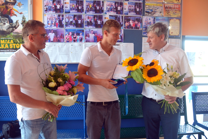 Po udanym występie na Mistrzostwach Świata w Budapeszcie Wojtek już dzisiaj pojawił się na brzeskiej pływalni. Został niezwykle ciepło i entuzjastycznie przywitany przez dyrektora i pracowników Brzeskiego Ośrodka Sportu i Rekreacji a także przez mieszkańców, którzy śledzili występy znakomitego zawodnika w czasie Mistrzostw Świata. Podziękowania oraz gratulacje mistrzowi przekazał także burmistrz Brzeska, Grzegorz Wawryka.