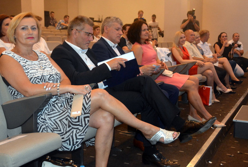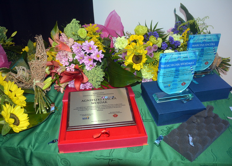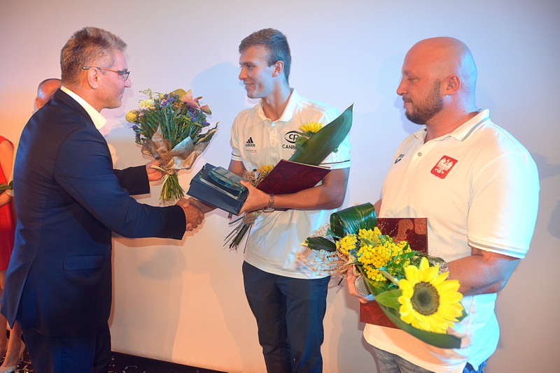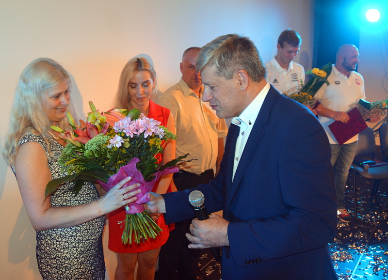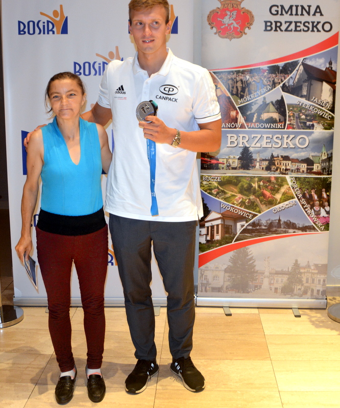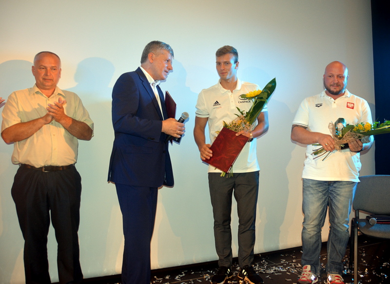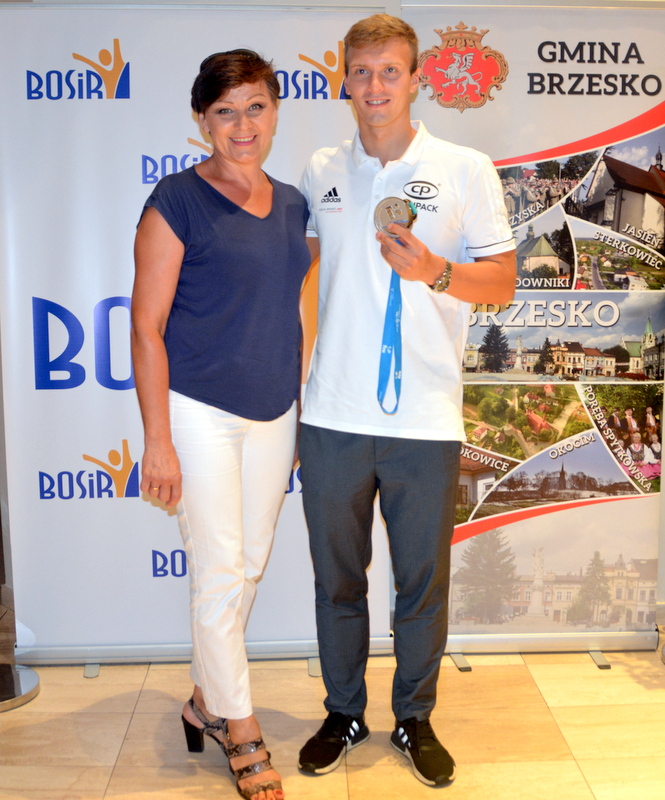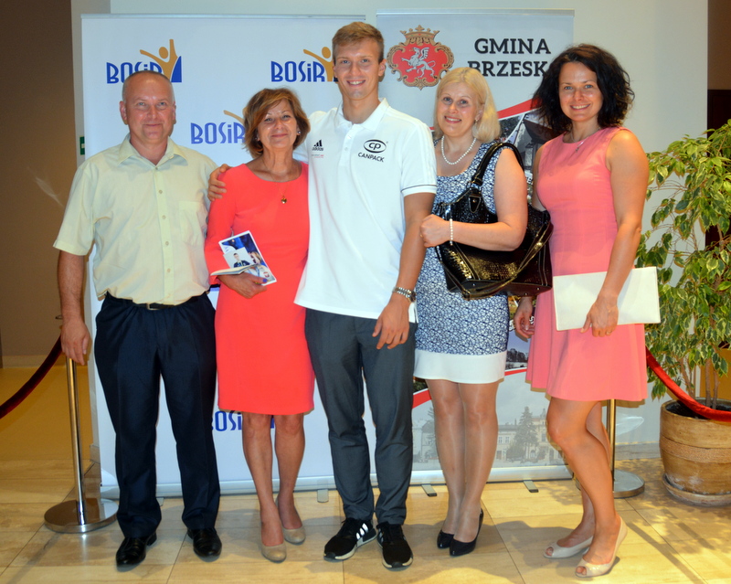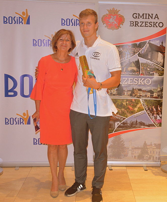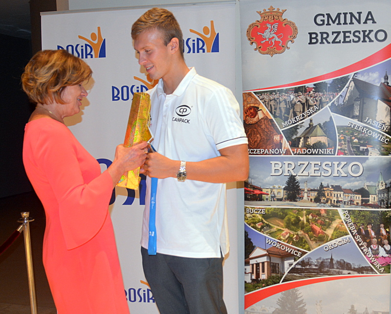 Zapewne miłą niespodzianką dla Wojtka było stypendium w wysokości 5 tysięcy złotych, które wręczył mu burmistrz Brzeska Grzegorz Wawryka. Burmistrz uhonorował również nagrodą rzeczową Marcina Kacera, a mamie Wojtka, pani Agnieszce Wojdak wręczył bukiet kwiatów. Dyrektor BOSiR-u, a zarazem prezes klubu pływackiego Marek Dadej w dowód uznania sukcesów duetu Wojdak-Kacer wręczył im pamiątkowe statuetki i kwiaty. Rodzice Wojtka, państwo Agnieszka i Jacek Wojdakowie otrzymali z rąk dyrektora pamiątkowy dyplom i kwiaty. Również pani Katarzyna Kura, menadżerka naszego pływaka została obdarowana kwiatami przez burmistrza i dyrektora.