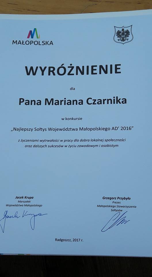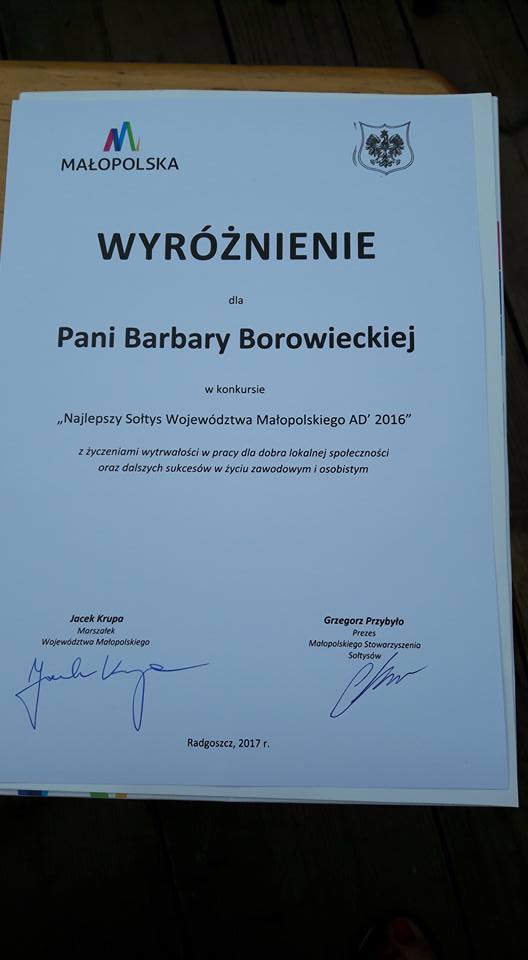 Barbara Borowiecka i Marian Czarnik zostali wyróżnieni w konkursie na najlepszego sołtysa województwa małopolskiego AD 2016. W tym roku konkurs rozstrzygnięto w Radgoszczy, w powiecie dąbrowskim, skąd pochodzi ubiegłoroczny laureat konkursu - Eugeniusz Stanek. Organizatorem konkursu było Małopolskie Stowarzyszenie Sołtysów wraz z marszałkiem województwa małopolskiego, gminami województwa małopolskiego, Agencją Restrukturyzacji i Modernizacji Rolnictwa oddział w Krakowie, Kasą Rolniczych Ubezpieczeń Społecznych oddział w Krakowie, Wojewódzkim Urzędem Pracy w Krakowie oraz instytucjami, z którymi współpracują sołtysi.