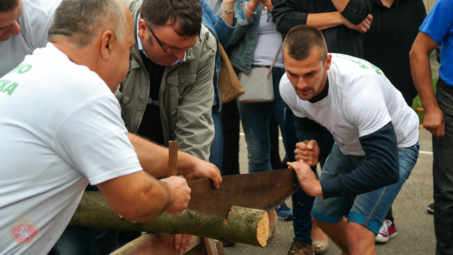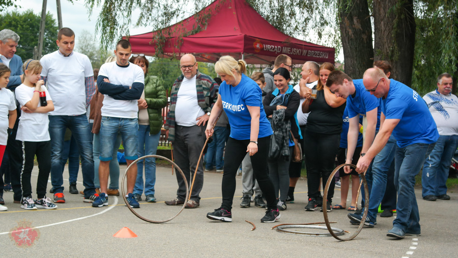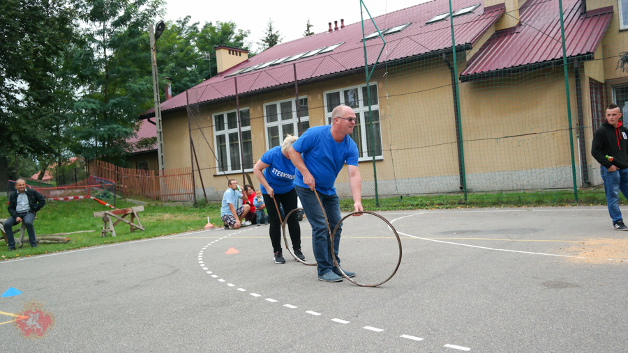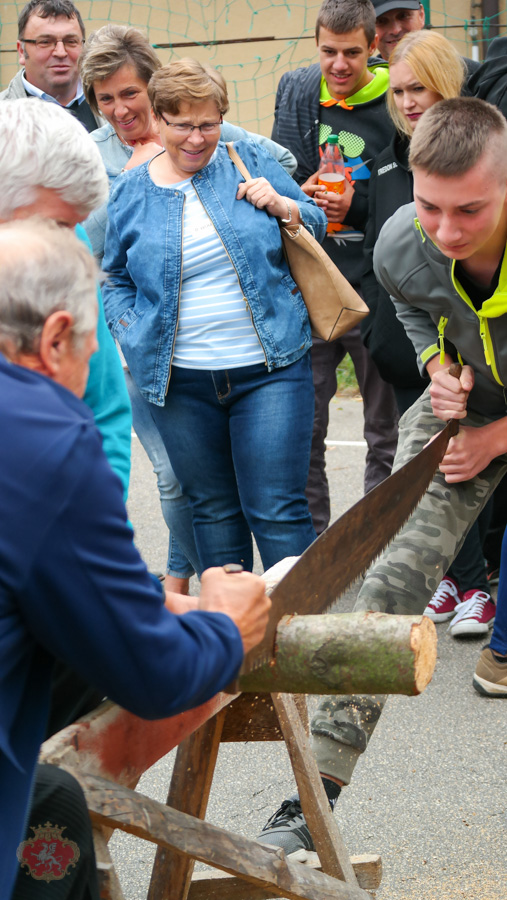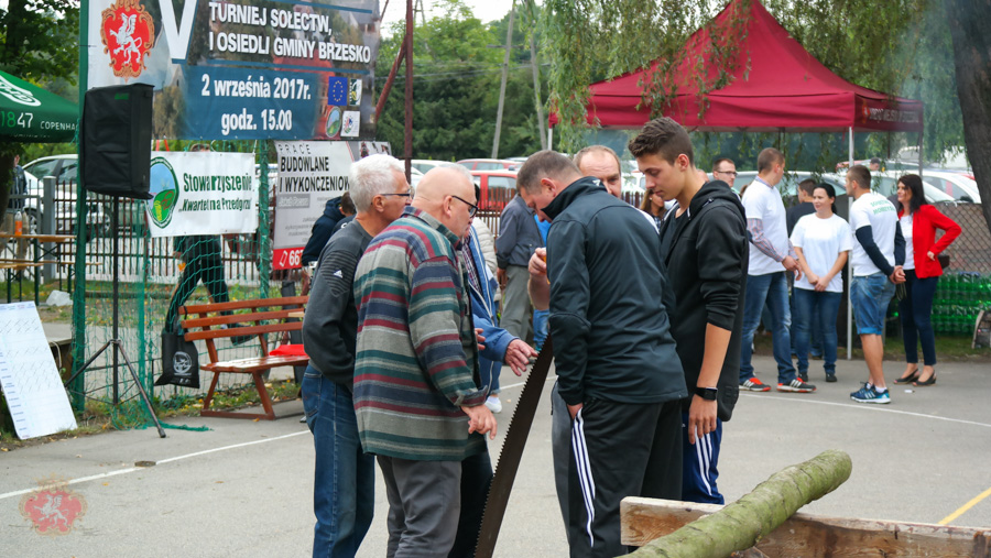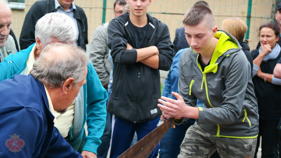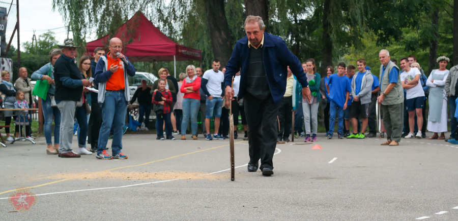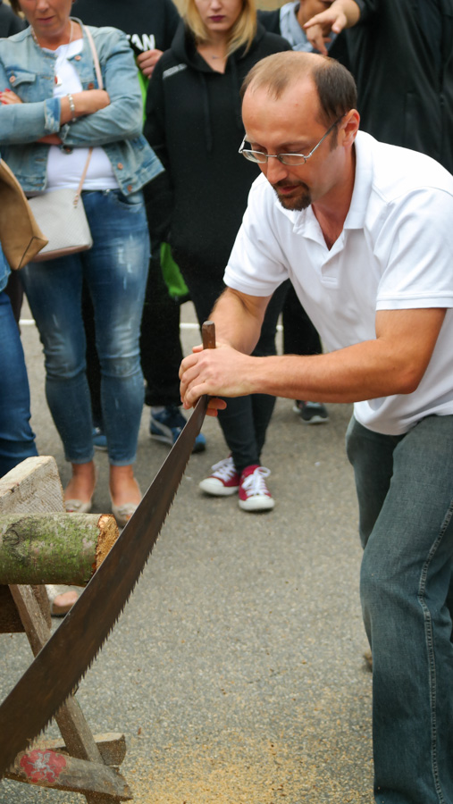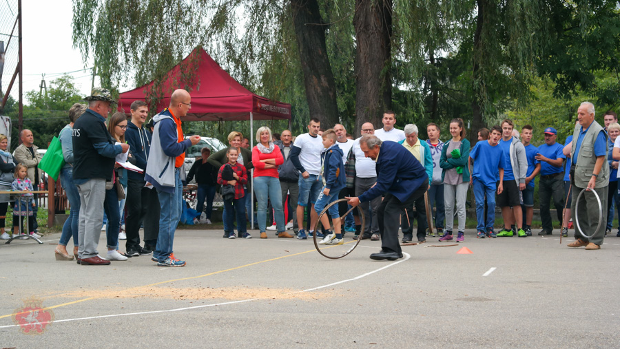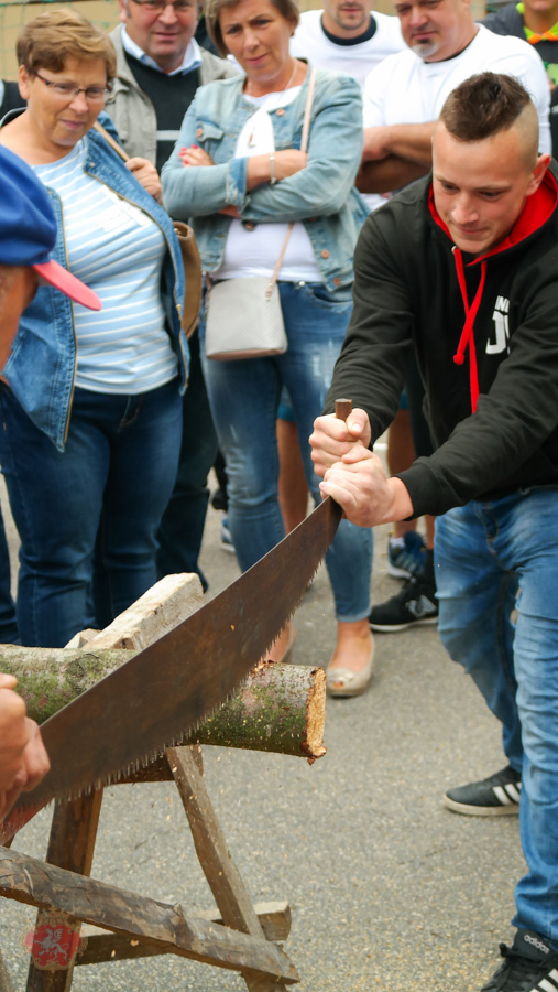 Wiele emocji, zarówno zawodnikom, jak i widzom dostarczyła konkurencja polegająca na piłowaniu drewna na czas. Zadanie polegało na przepiłowaniu kłody drewna ułożonej na koziołkach, podczas gdy dwie osoby przecinało drewno, pozostali zawodnicy musieli podtrzymywać koziołki, aby te nie przewróciły się. Równych sobie nie miała drużyna z Bucza, która kloc przepiłowała w zaledwie 7,87 sekundy. Wyrównana walka toczyła się w czasie rzutu piłką do opony, zaś zabawy co niemiara było w czasie biegu z rachewką, którą należało popychać patykiem. Łatwo nie było, bo dla większości uczestników była to nowość, w tej konkurencji zwyciężyli zawodnicy z Mokrzysk.