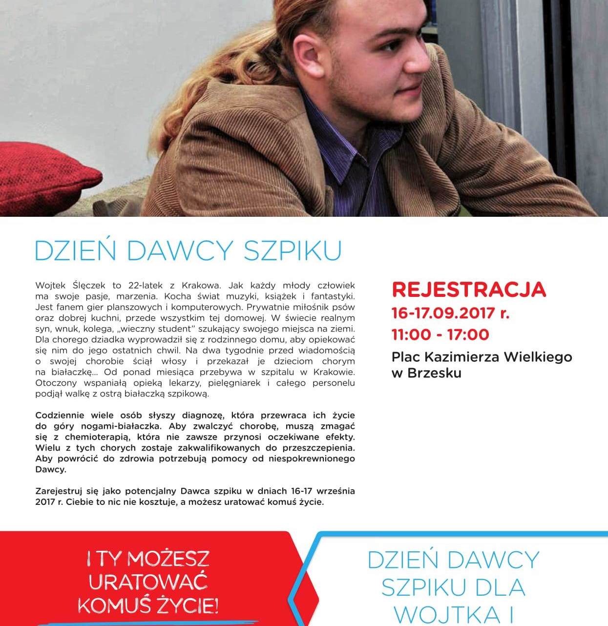 Akcja w Brzesku przebiegać będzie pod hasłem „Dla Wojtka i innych”. Wojtek Ślęczek – to chłopak, którego rodzina pochodzi z okolic Jasienia. Jak każdy młody człowiek ma swoje pasje, marzenia. Kocha świat muzyki, książek i fantastyki. Jest fanem gier planszowych i komputerowych. Prywatnie miłośnik psów oraz dobrej kuchni, przede wszystkim tej domowej. W świecie realnym syn, wnuk, kolega, „wieczny student” szukający swojego miejsca na ziemi. Dla chorego dziadka wyprowadził się z rodzinnego domu, aby opiekować się nim do jego ostatnich chwil. Na dwa tygodnie przed wiadomością o swojej chorobie ściął włosy i przekazał je dzieciom chorym na białaczkę... Od ponad miesiąca przebywa w szpitalu w Krakowie. Otoczony wspaniałą opieką lekarzy, pielęgniarek i całego personelu podjął walkę z ostrą białaczką szpikową.
