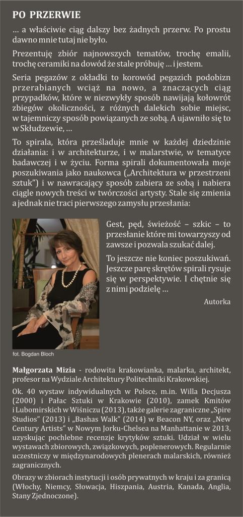 Od 12 grudnia w miejskiej bibliotece czynna będzie wystawa malarstwa Małgorzaty Mizi zatytułowana „Po przerwie”. Ekspozycja krakowskiej artystki prezentuje przekrojowy wybór prac z ostatnich lat. Są to cykle malarskie o różnej tematyce od pejzażu architektonicznego po przedstawienia mityczne, zwierzęce, obiekty ceramiczne i kilka emaliowanych na metalu.