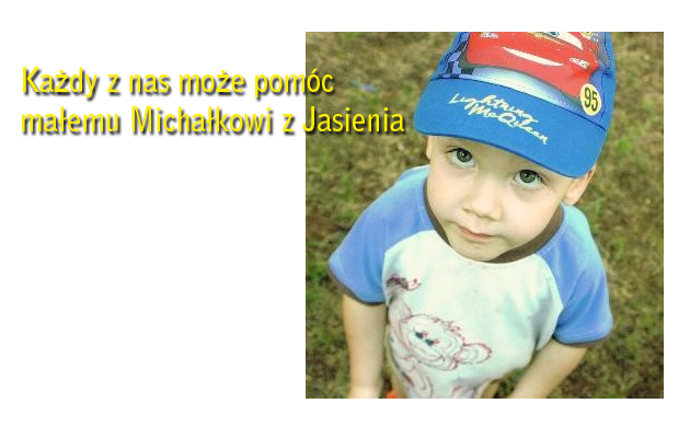 Pomóc Michałkowi można dokonując wpłaty na konto: Fundacja Pomocy Dzieciom i Osobom Chorym “Kawałek Nieba” Bank BZ WBK 31 1090 2835 0000 0001 2173 1374 Tytułem: “1196 pomoc dla Michała Biel”wpłaty zagraniczne – foreign payments to help Michal: Fundacja Pomocy Dzieciom i Osobom Chorym “Kawałek Nieba” PL31109028350000000121731374 swift code: WBKPPLPP Bank Zachodni WBK Title: “1196 Help for Michal Biel”Aby przekazać 1% podatku dla Michałka: należy w formularzu PIT wpisać KRS 0000382243 oraz w rubryce ’Informacje uzupełniające – cel szczegółowy 1%’ wpisać “1196 pomoc dla Michała Biel”