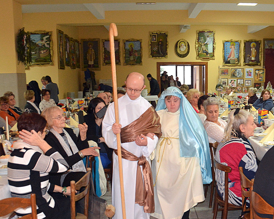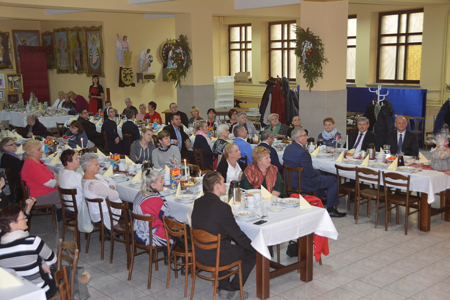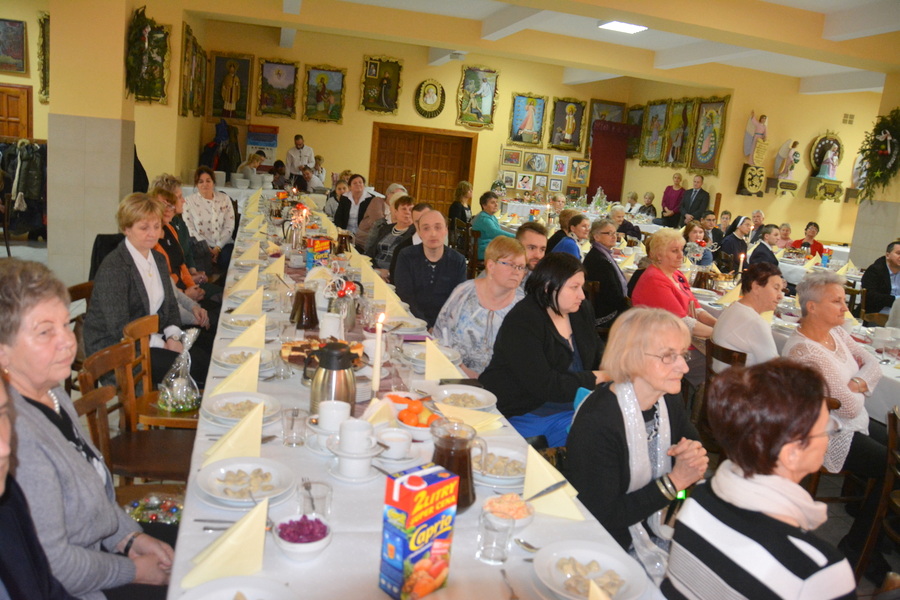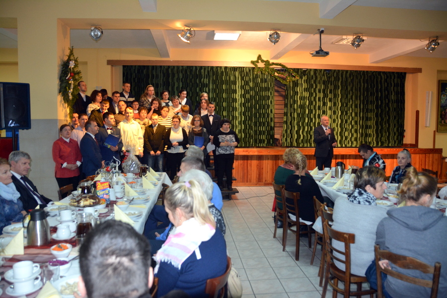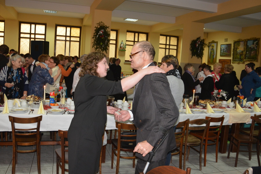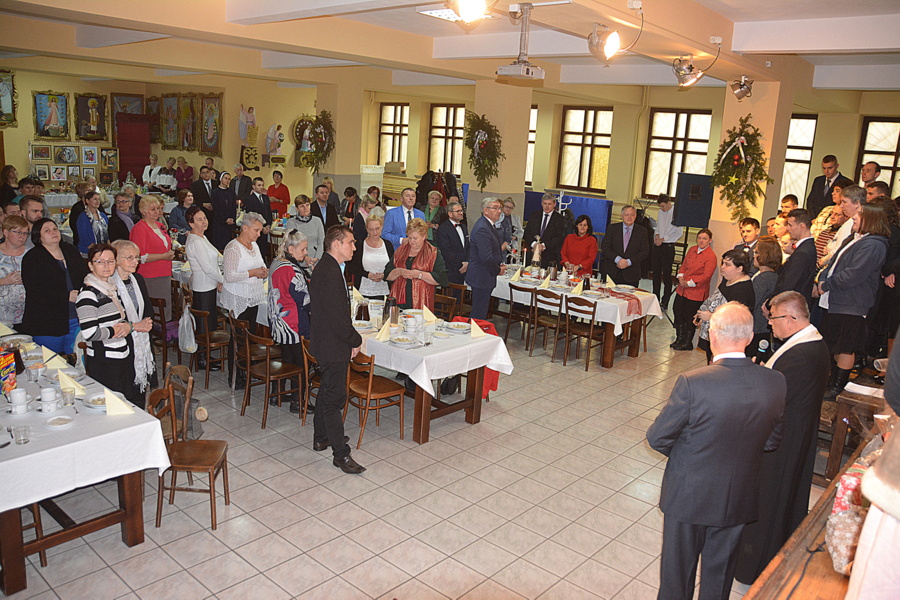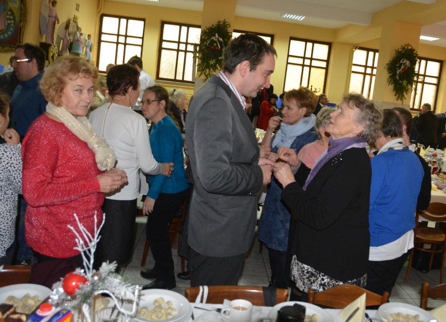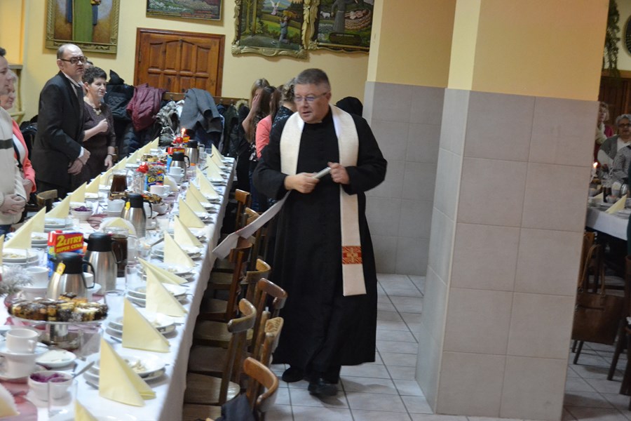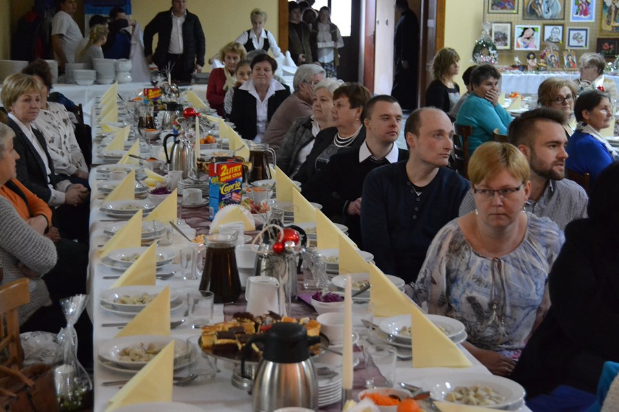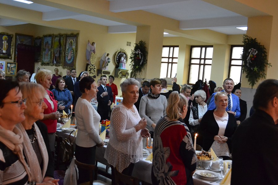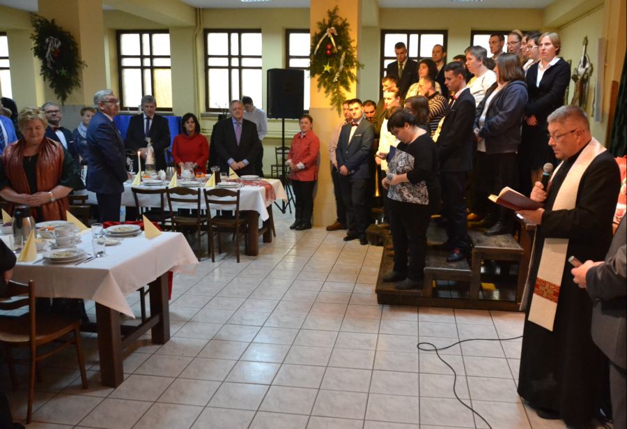 Na spotkaniu opłatkowym obecni byli także duszpasterz osób niepełnosprawnych ks. Józef Waśko, oraz proboszcz parafii NMP Matki Kościoła i Św. Jakuba Apostoła, prałat Józef Drabik, który odmówił modlitwę i poświęcił opłatki. Potem nadszedł czas na wzajemne życzenia i tradycyjne łamanie się opłatkiem. Następnie wszyscy zasiedli do wspólnego wigilijnego poczęstunku.