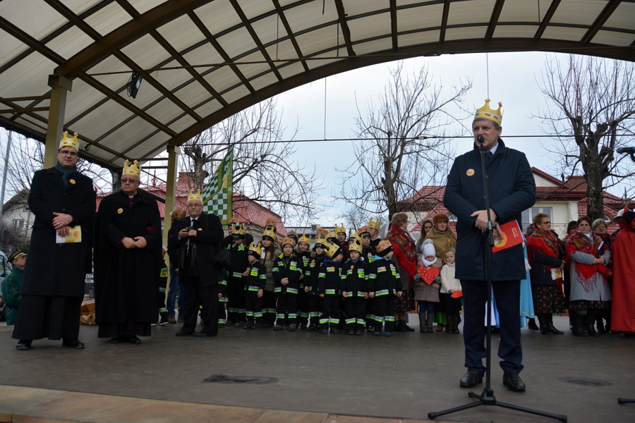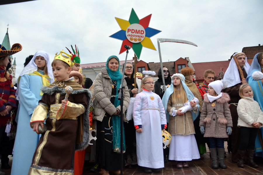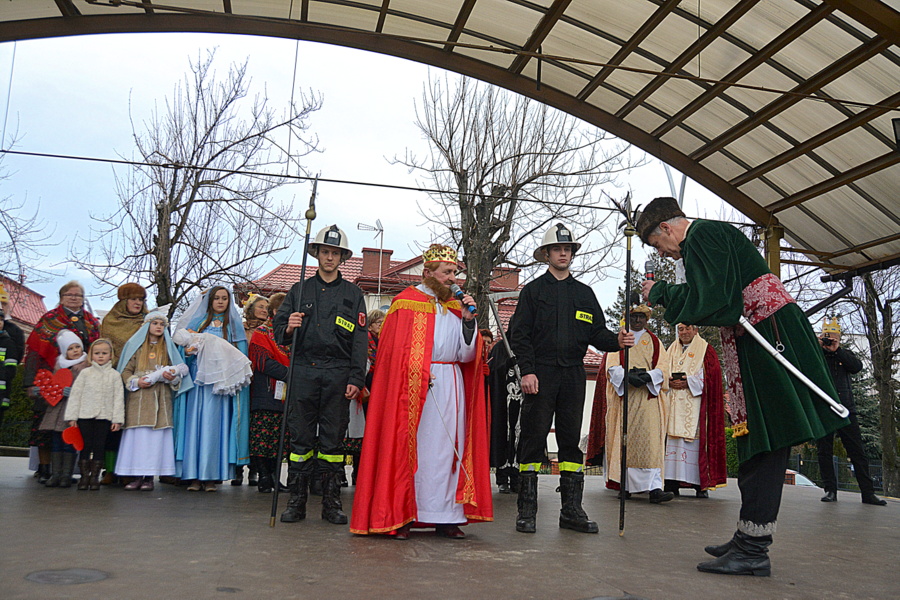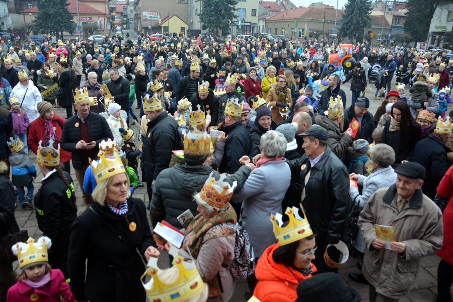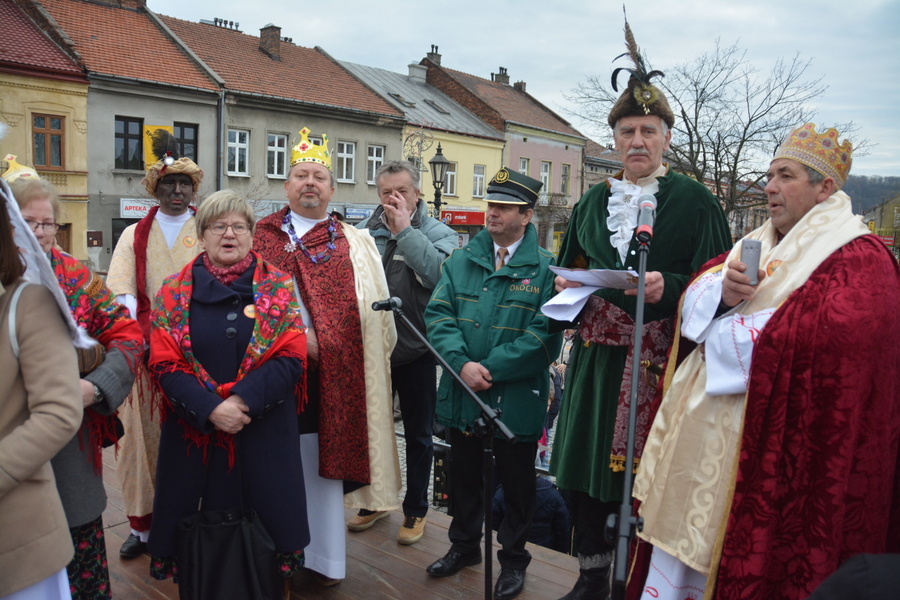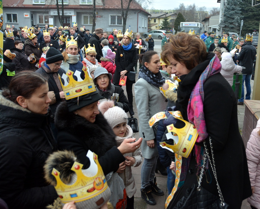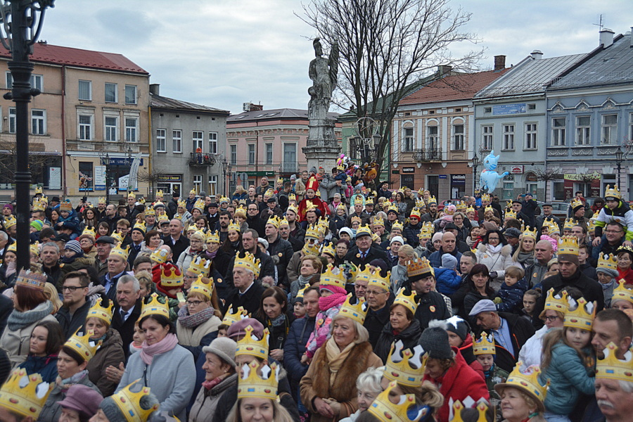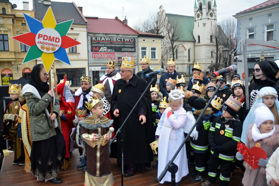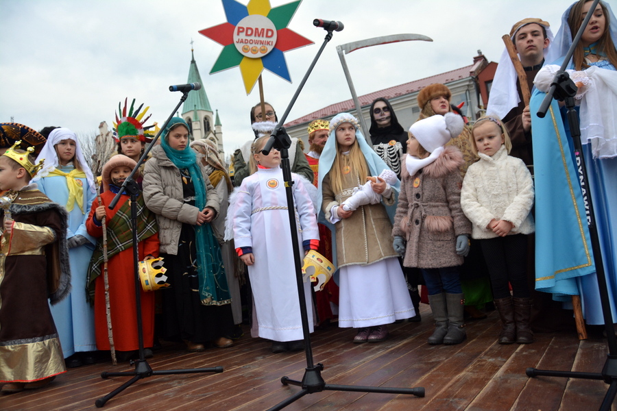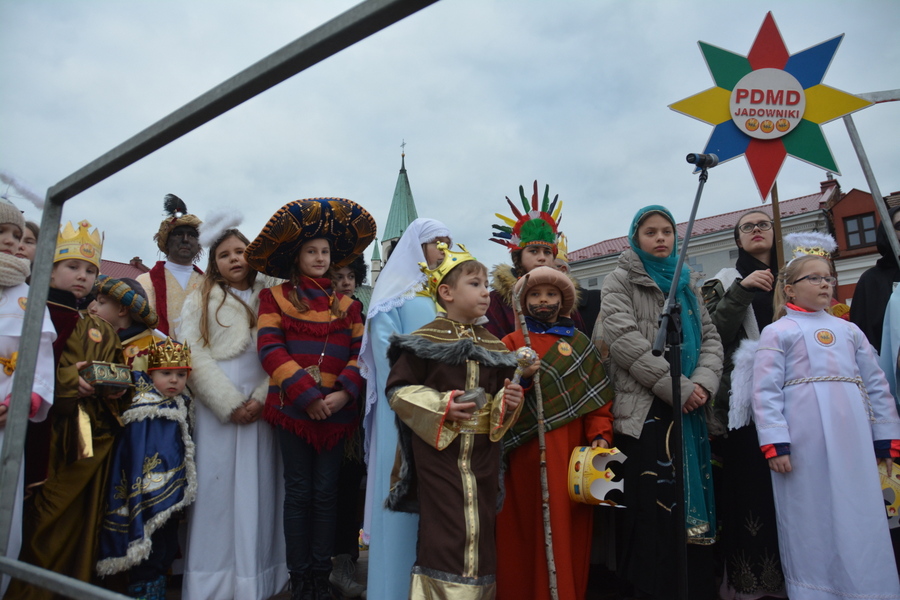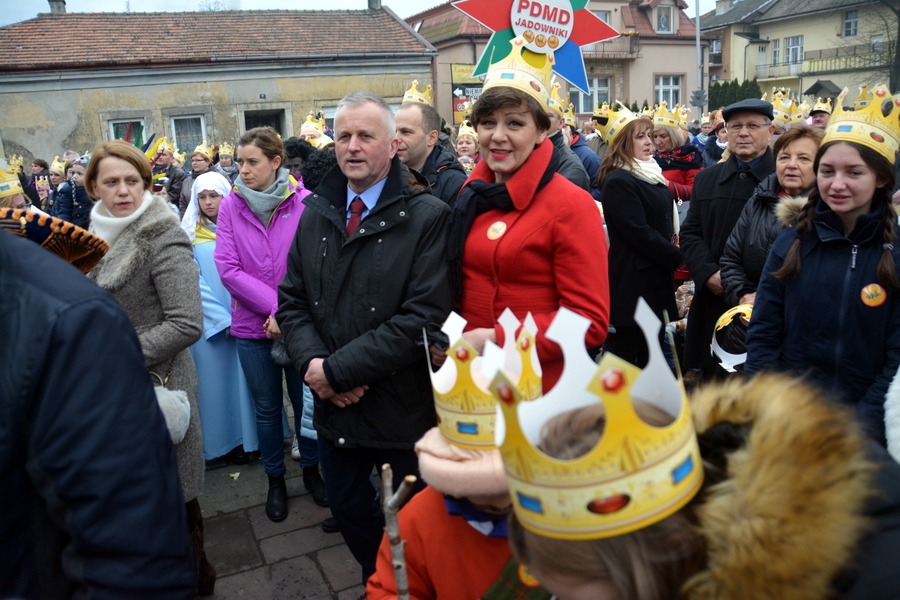 Zbiórka uczestników orszaku odbyła się na Placu Kazimierza Wielkiego, gdzie jego uczestników powitał burmistrz Grzegorz Wawryka wraz z księżmi Józefem Drabikiem i Wojciechem Wernerem, którzy rozdali wraz z radnymi Rady Miejskiej i strażakami Dziecięcej Grupy Pożarniczej przy OSP Jadowniki korony, śpiewniki i naklejki z symbolami Święta Trzech Króli. Przed wymarszem Grupa Śpiewacza Jadowniczanie zaprezentowała fragment bożonarodzeniowych jasełek.