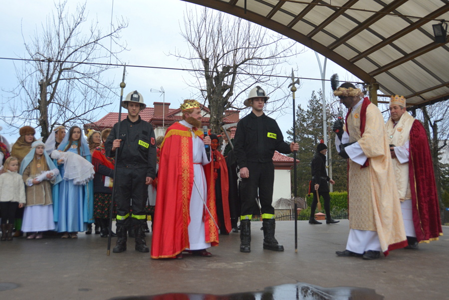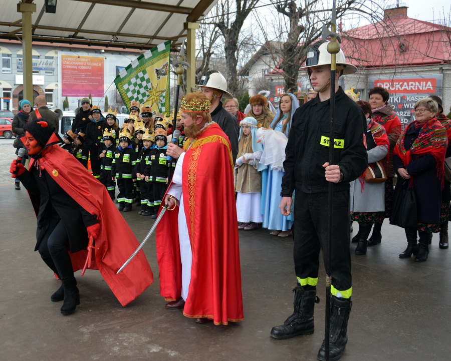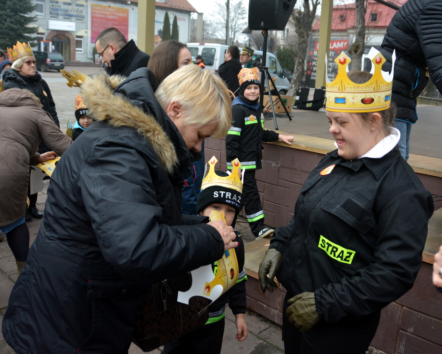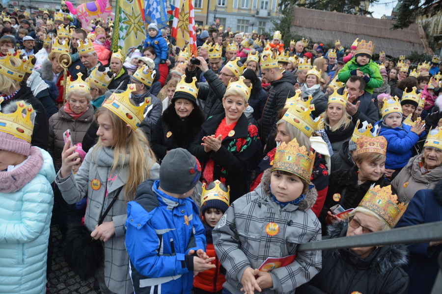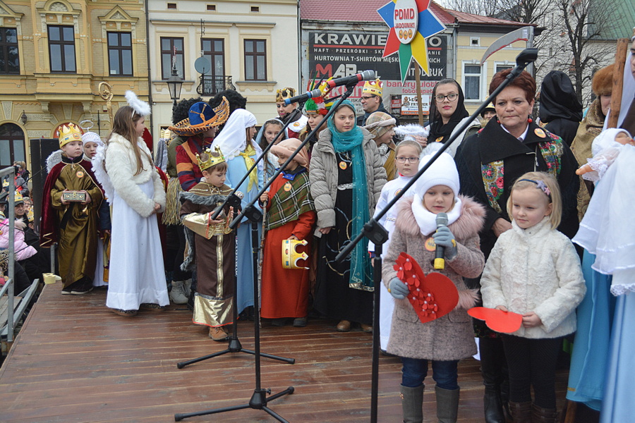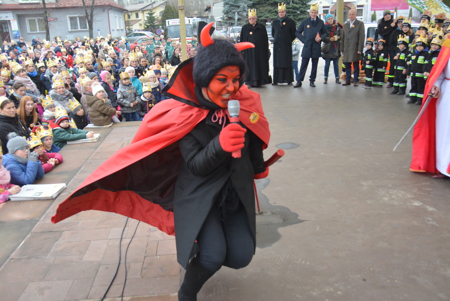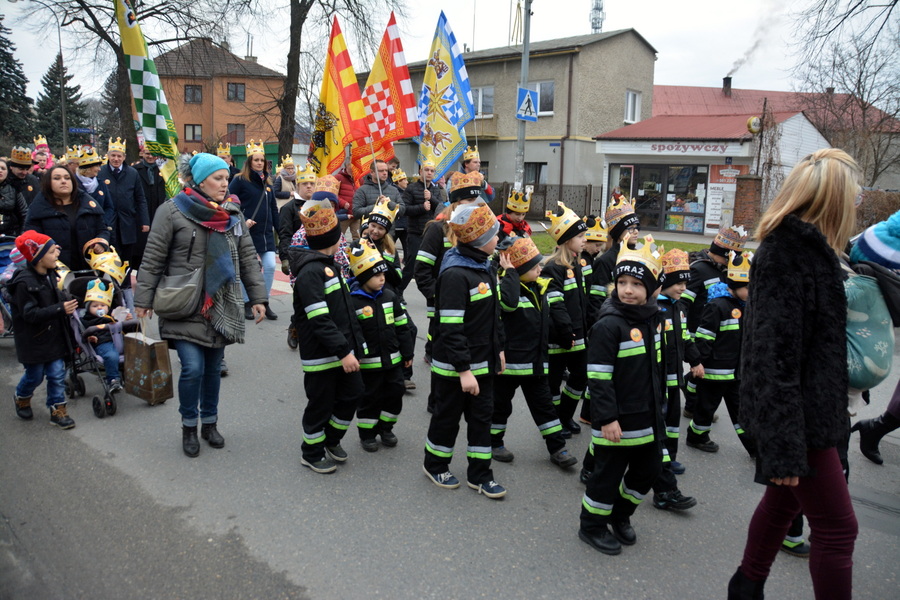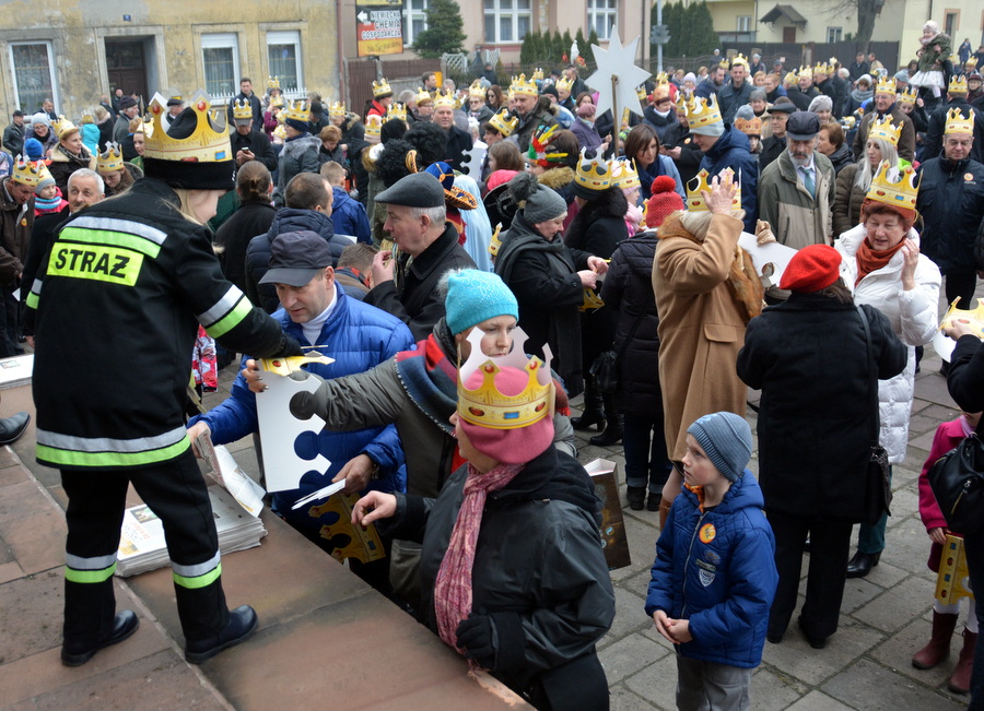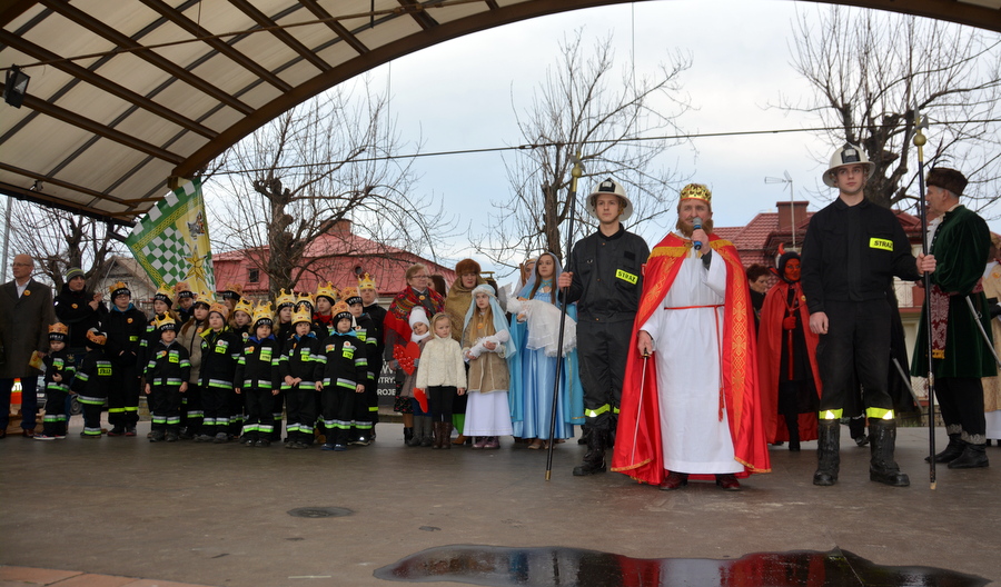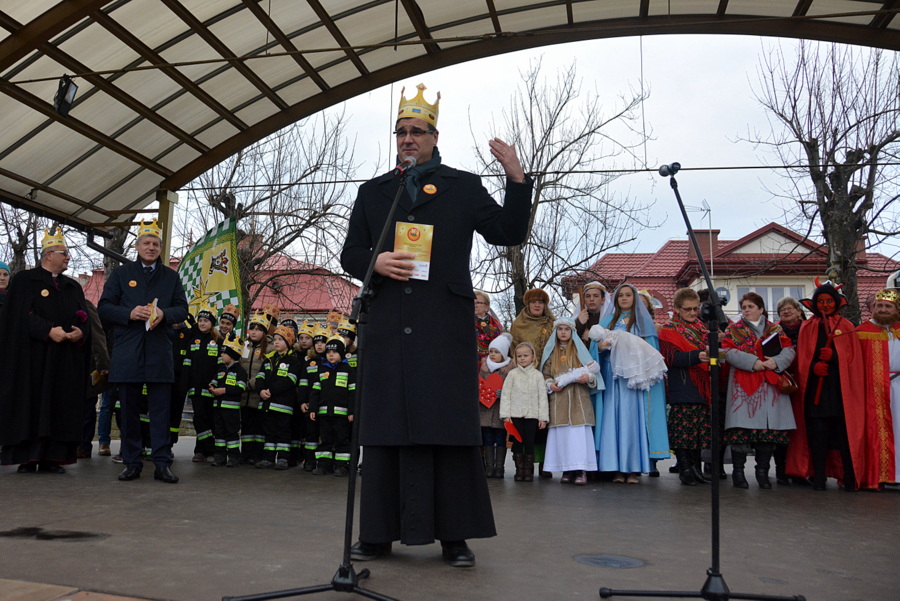 Zbiórka uczestników orszaku odbyła się na Placu Kazimierza Wielkiego, gdzie jego uczestników powitał burmistrz Grzegorz Wawryka wraz z księżmi Józefem Drabikiem i Wojciechem Wernerem, którzy rozdali wraz z radnymi Rady Miejskiej i strażakami Dziecięcej Grupy Pożarniczej przy OSP Jadowniki korony, śpiewniki i naklejki z symbolami Święta Trzech Króli. Przed wymarszem Grupa Śpiewacza Jadowniczanie zaprezentowała fragment bożonarodzeniowych jasełek.