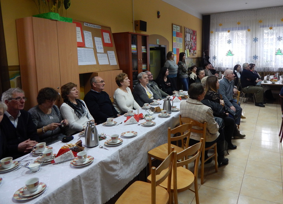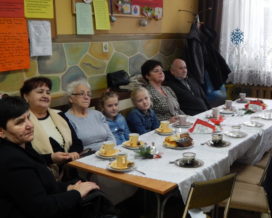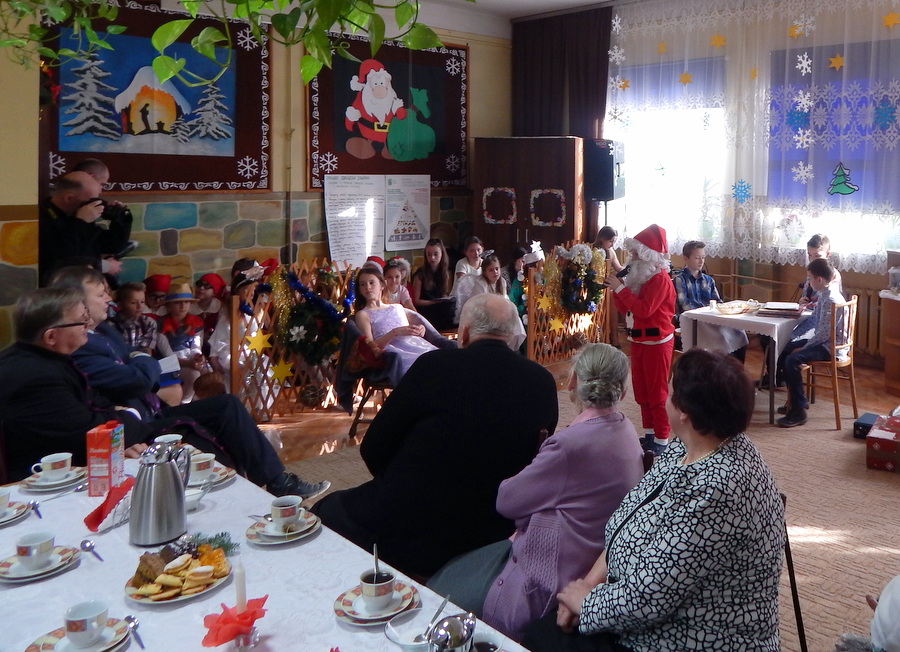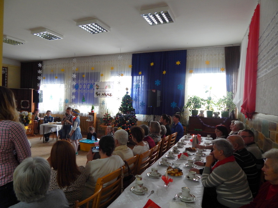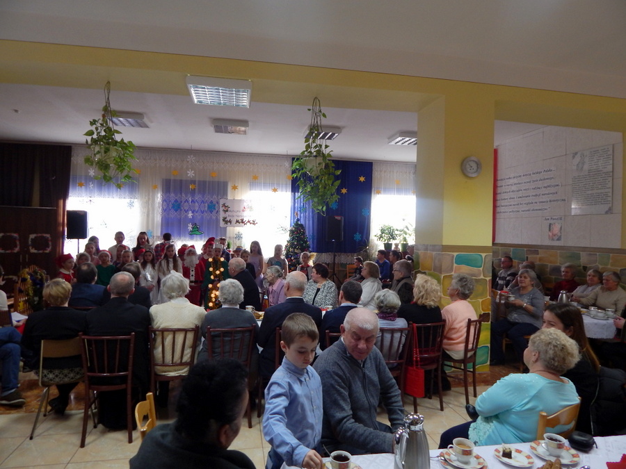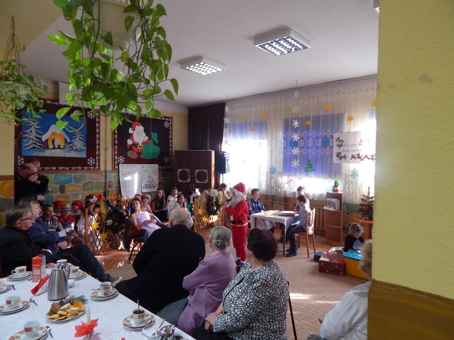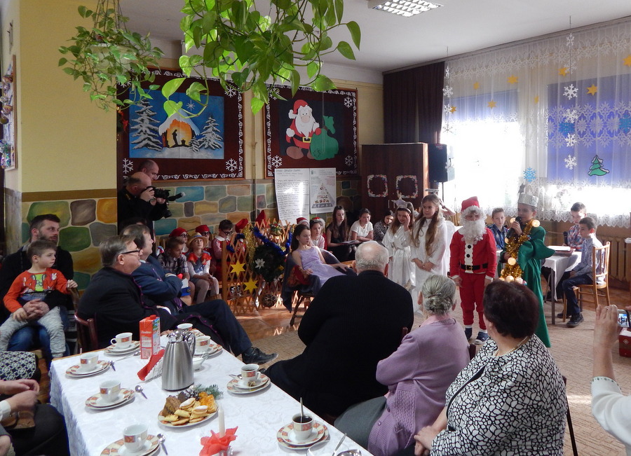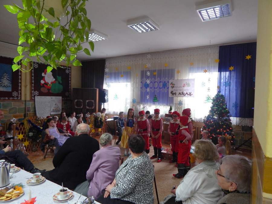 Pod czujnym okiem Kasi Kargol i Kasi Jandziś dzieci przygotowały dla seniorów przedstawienie „Ratujmy święta Bożego Narodzenia”, w którym nie zabrakło znanych bajkowych postaci, a nawiązywało ono do aktualnych problemów współczesnej rodziny. Dzieci podkreślały w przedstawieniu, że nic nie jest w stanie zastąpić babci i dziadka, żadne zabawki, komputerowe gry czy telewizor. Na zakończenie podarowały babciom i dziadkom własnoręcznie wykonane laurki. Nie zabrakło wspólnego kolędowania, a po nim wspólnego śpiewania starych piosenek, które seniorzy pamiętają z czasów swojej młodości. Pomógł w tym akordeonista pan Paweł.