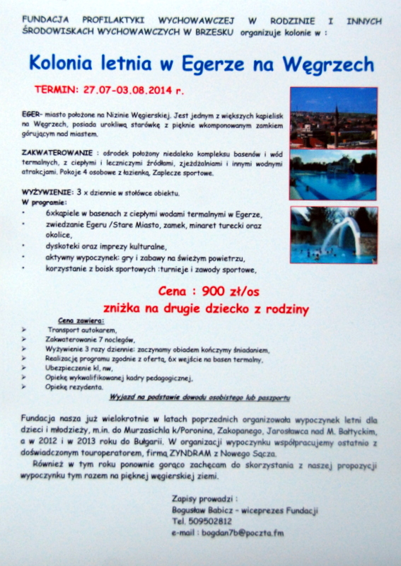 Fundacja Profilaktyki Wychowawczej w Rodzinie i Innych Środowiskach Wychowawczych w Brzesku organizuje kolonie letnią w Egerze, mieście położonym na Nizinie Węgierskiej w terminie 27.07- 03.08.2014 r. Szczegóły w załączniku.DSC_9569
