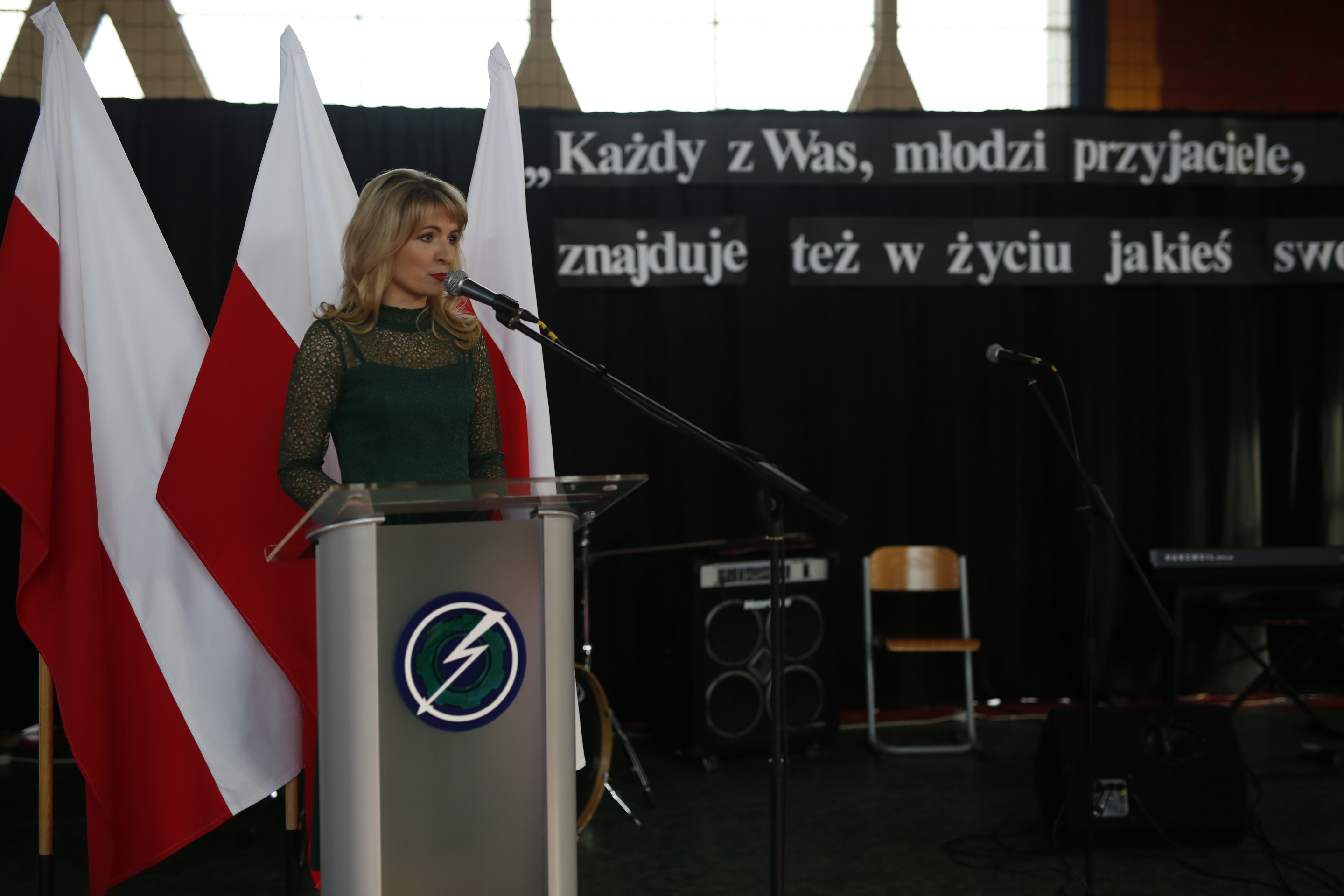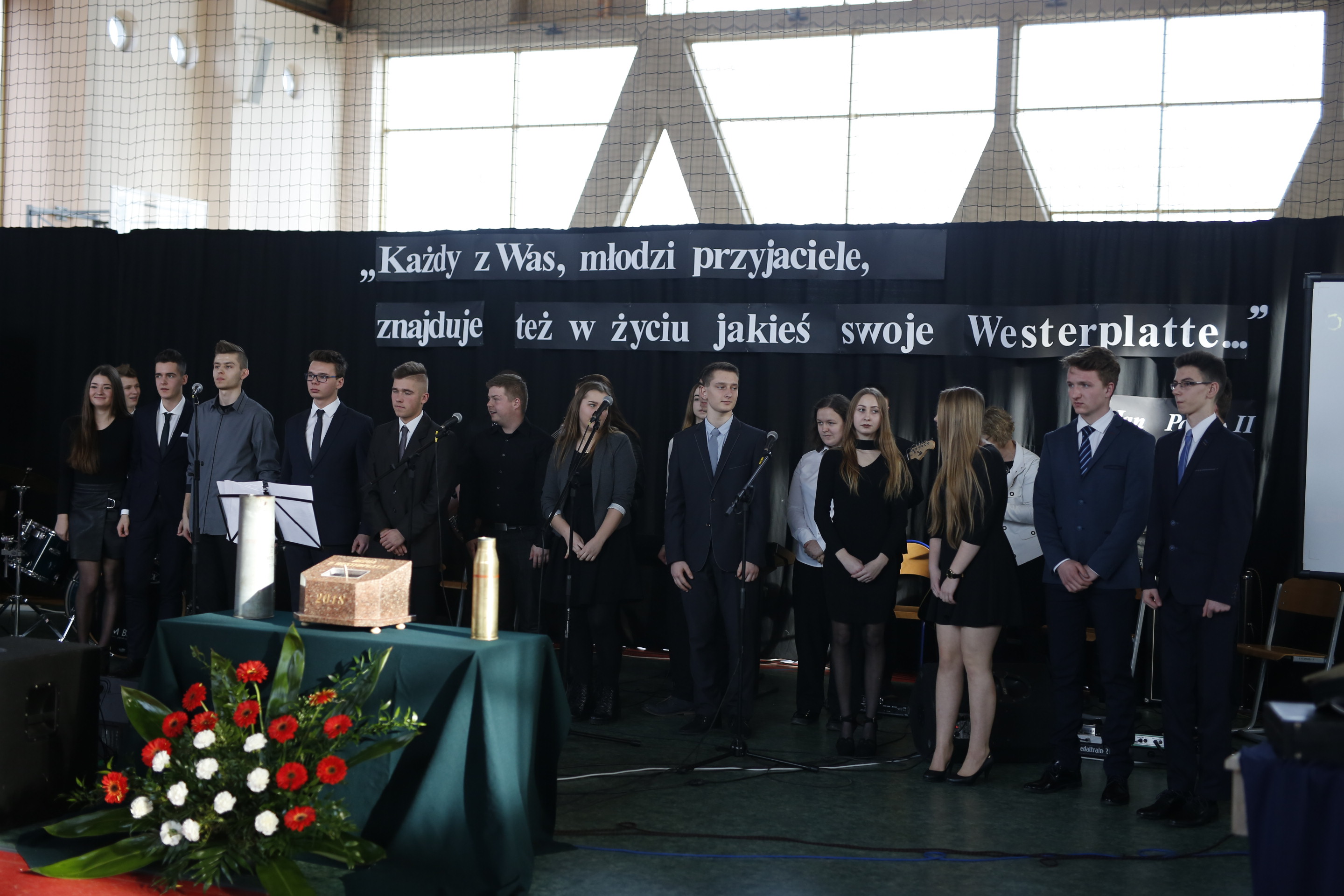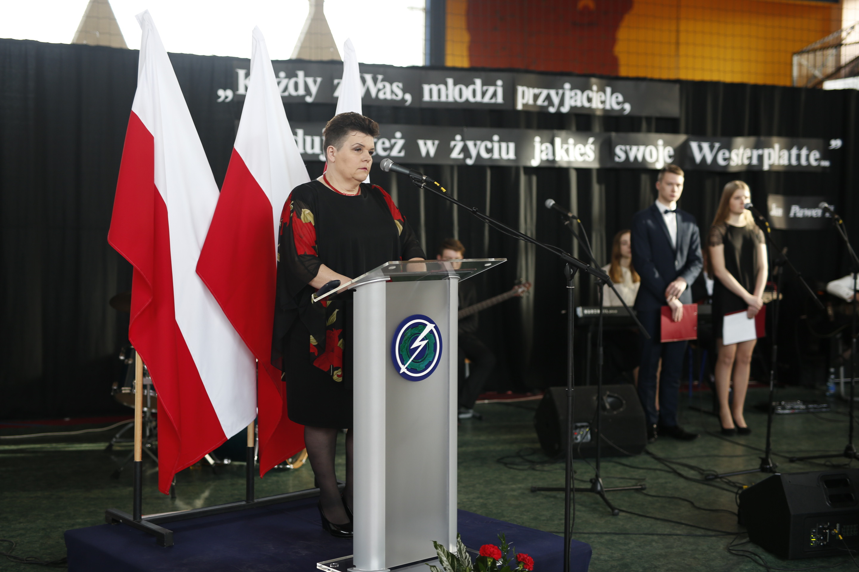 Następnie wicedyrektor szkoły, Patrycja Ptak-Żołna przedstawiła relację z wizyty samorządu uczniowskiego na Westerplatte. W pełnych powagi słowach odniosła się nie tylko do obowiązku pamiętania o naszych patronach, ale także konieczności brania z nich przykładu. Przywołując słowa św. Jana Pawła II „Każdy z Was znajduje też w życiu jakieś swoje Westerplatte, jakiś wymiar zadań, które trzeba podjąć i wypełnić, jakąś słuszną sprawę, o którą nie można nie walczyć...” wezwała młodych ludzi do odkrycia tego, co jest tym Westerplatte dla każdego z nich, do zajęcia zdecydowanej postawy obrony tego bezcennego przyczółka.