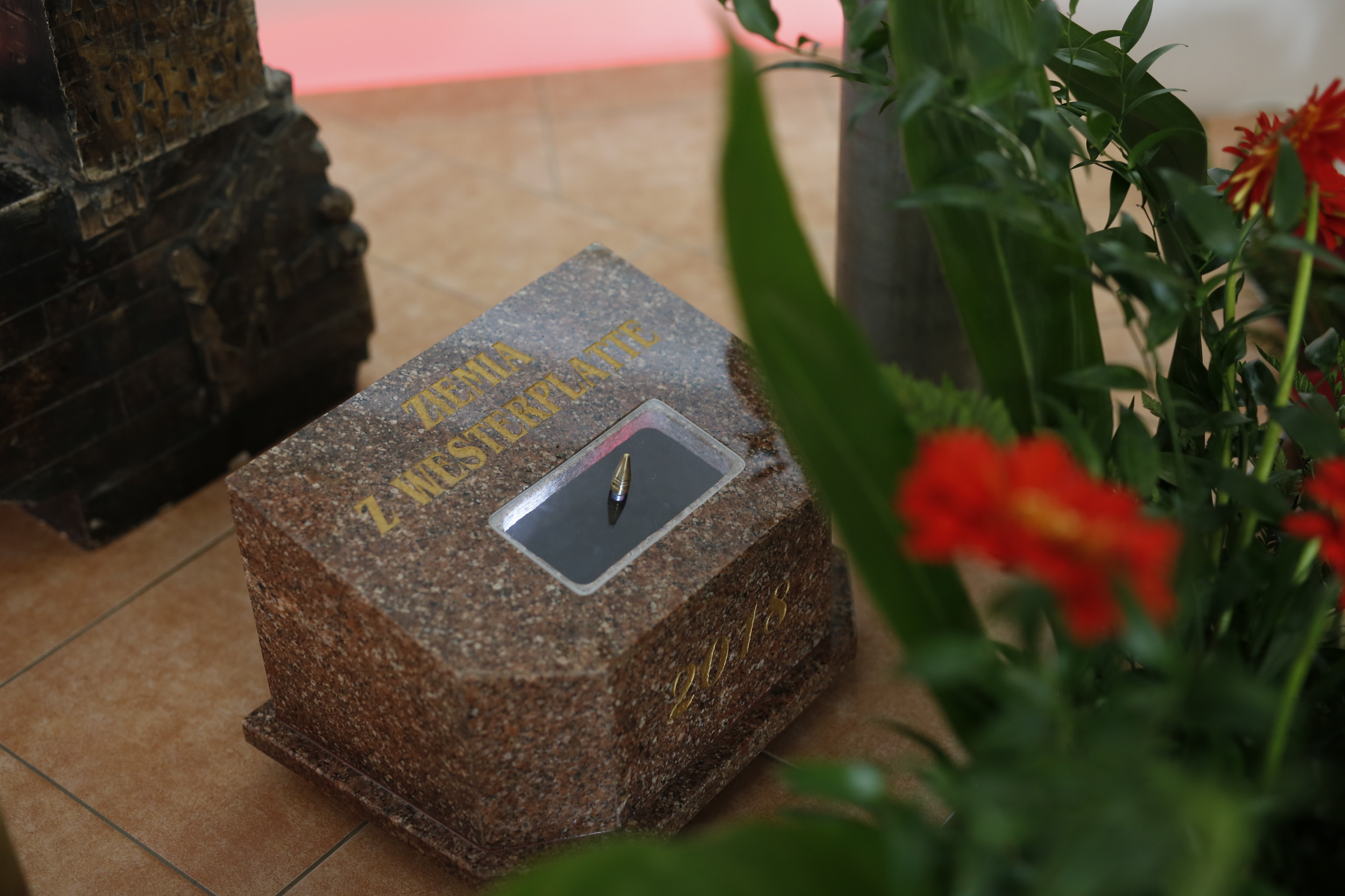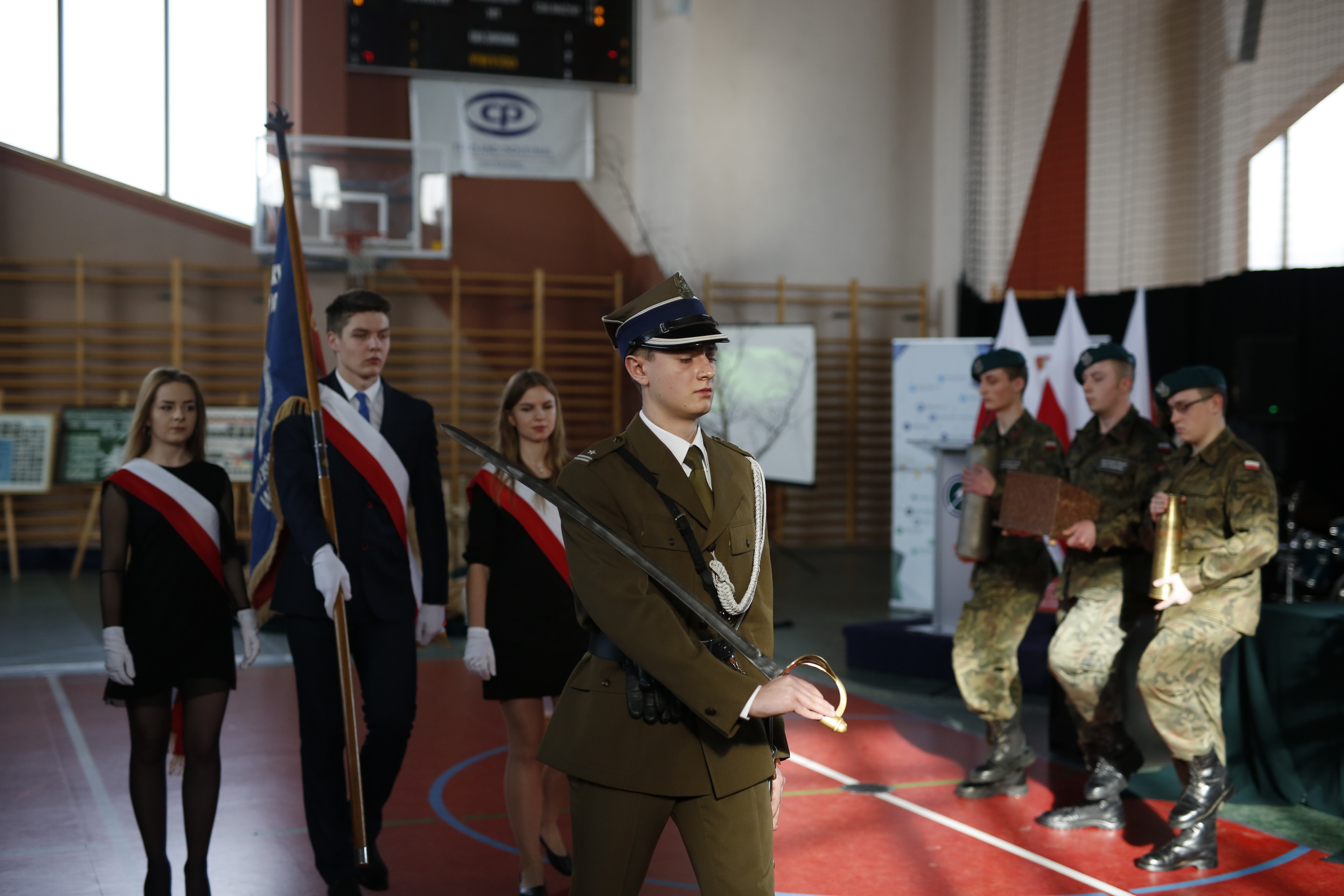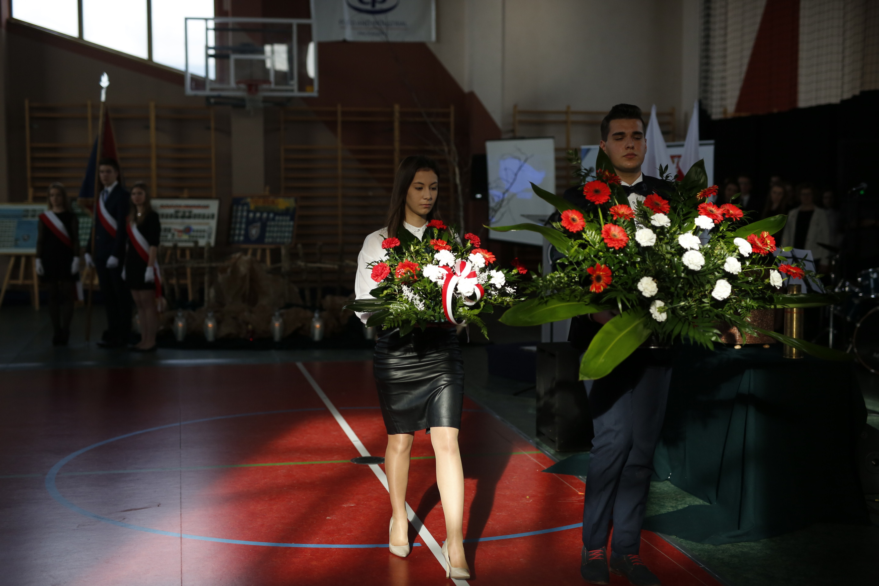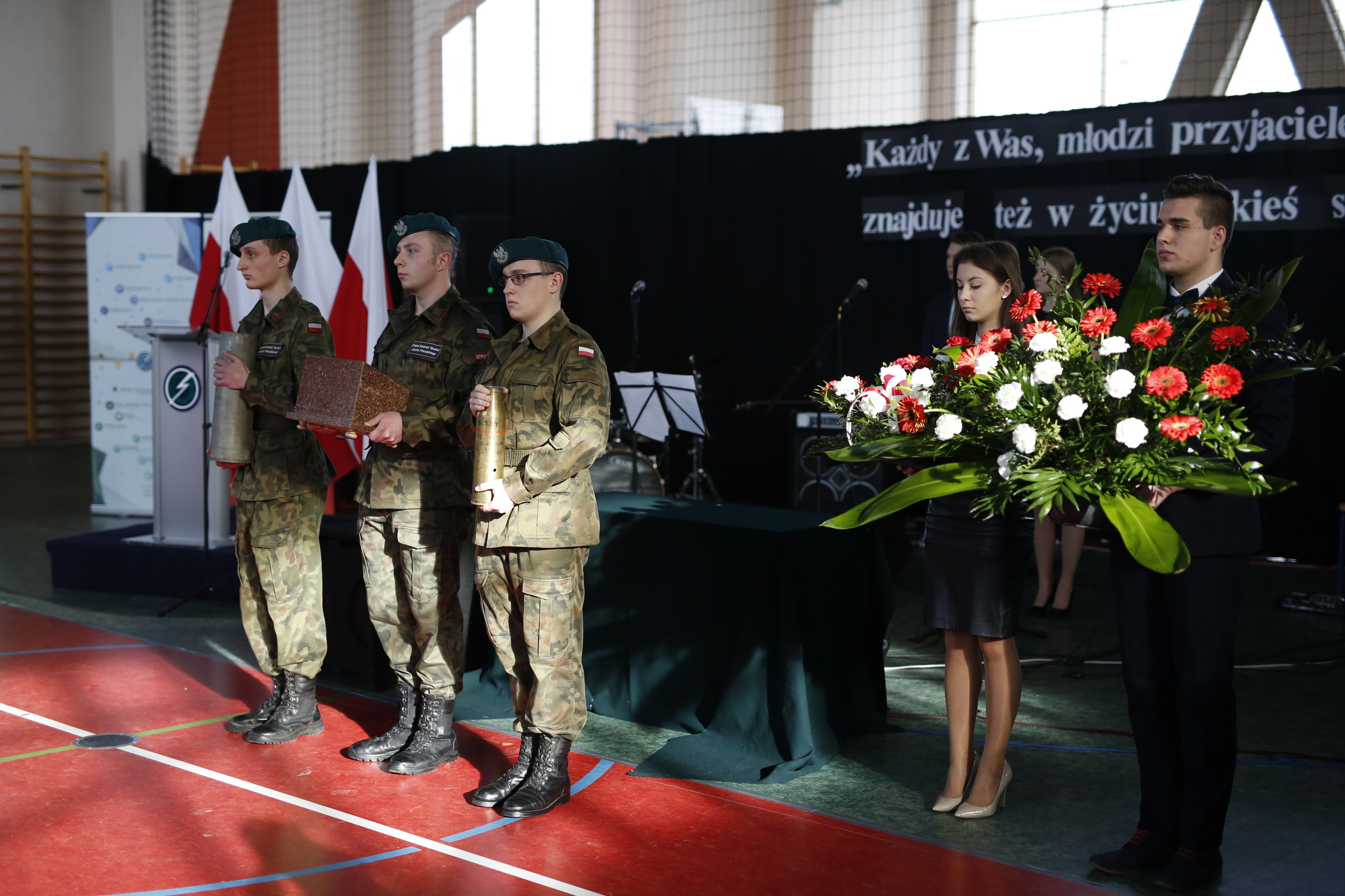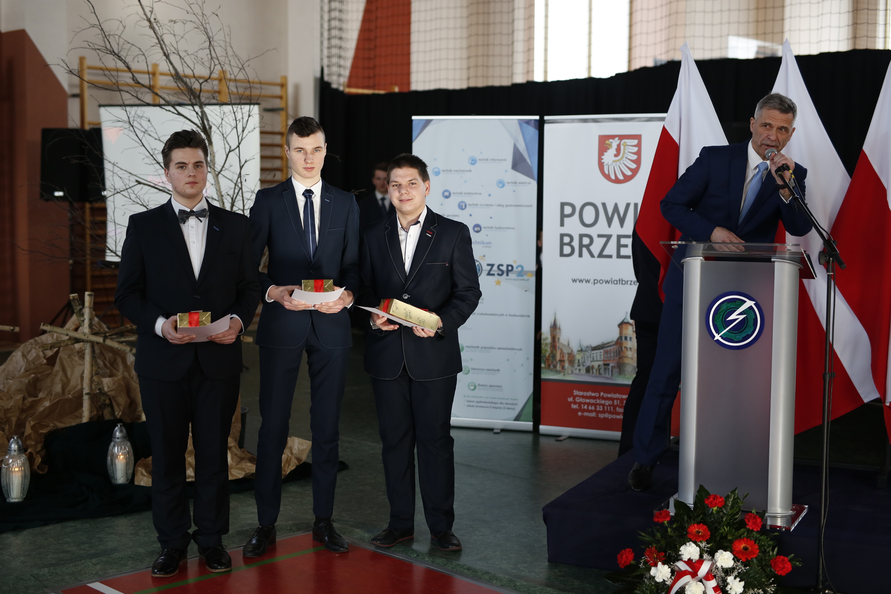 W tej podniosłej chwili włodarze powiatu brzeskiego, dyrekcja, zaproszeni goście oraz uczniowie oddali hołd patronom szkoły składając pod pomnikiem wiązanki kwiatów i urnę z ziemią przywiezioną przez samorząd uczniowski z Westerplatte.