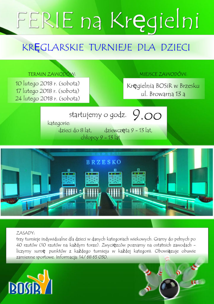 Wiele atrakcji dla najmłodszych mieszkańców gminy przygotował Brzeski Ośrodek Sportu i Rekreacji. W czasie ferii w pływalni i w kręgielni można będzie o wiele taniej kupić wejściówki. BOSiR zaprasza także na kręglarskie turnieje. Więcej informacji na załączonych plakatach.