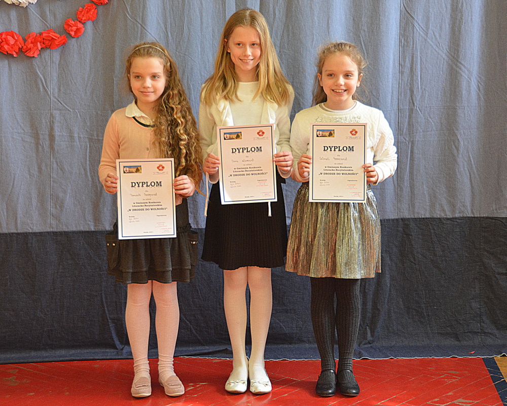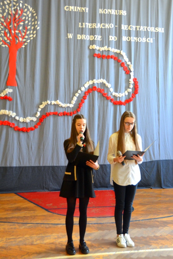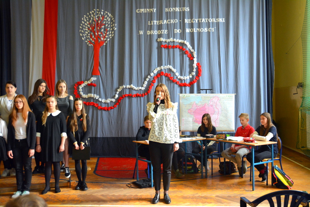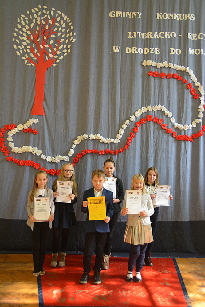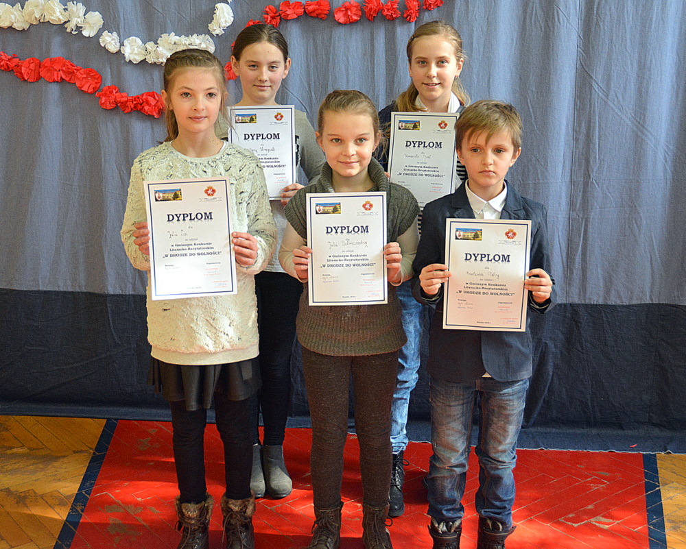 Uczniowie ci mieli szansę powalczyć o miejsca ,,na podium”. Każdy z nich w drugiej rundzie zaprezentował recytację wybranego przez siebie utworu o tematyce patriotycznej. Jury w składzie Karina Legutek - dyrektor Powiatowej i Miejskiej Biblioteki Publicznej, Maria Marek była dyrektor biblioteki Publicznej w Brzesku i Ewelina Stępień - instruktor teatralno - muzyczny Miejskiego Ośrodka Kultury uznało, że laureatami Gminnego Konkursu Literacko – Recytatorskiego „W drodze do wolności” zostali: W starszej grupie I miejsce Nadia Kita z PSP 2 w Brzesku; II miejsce Gabriela Duda z PSP 2 w Brzesku; III miejsce Dominika Cholewa z PSP w Morzyskach. W młodszej grupie: I miejsce Maciej Żurek z PSP 3 w Brzesku; II miejsce Aleksandra Serwatka z PSP w Porębie Spytkowskiej i III miejsce Maria Jurek z PSP w Sterkowcu.