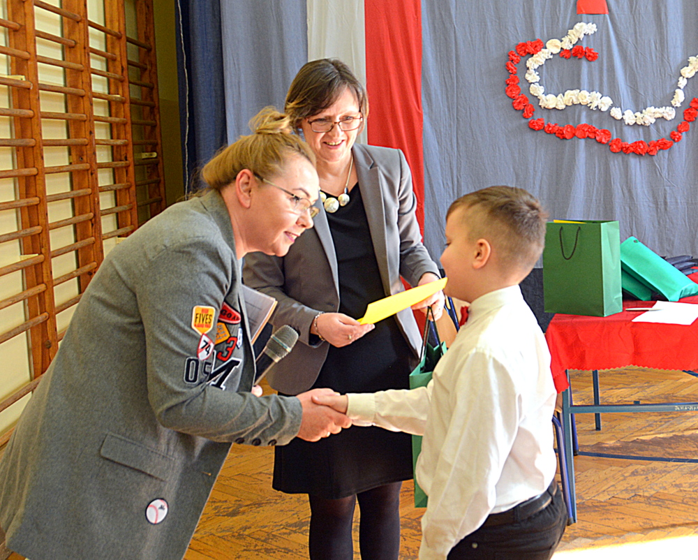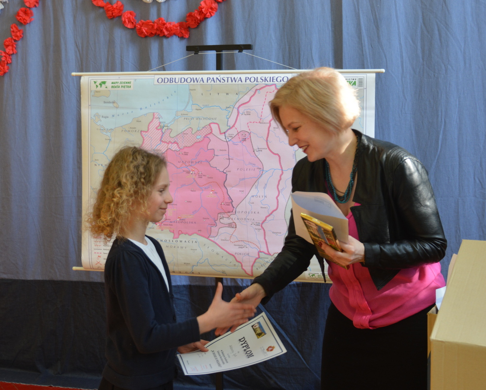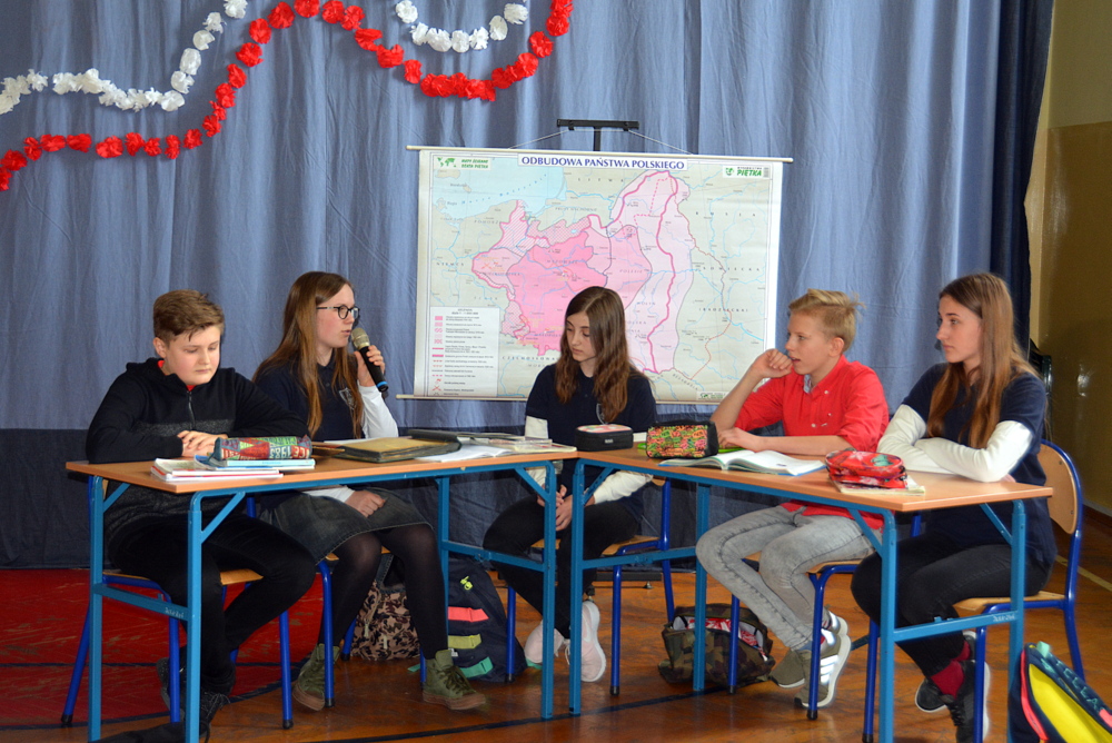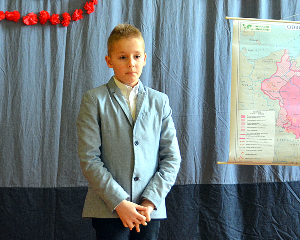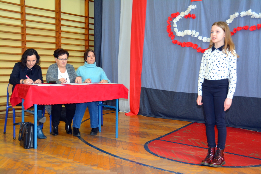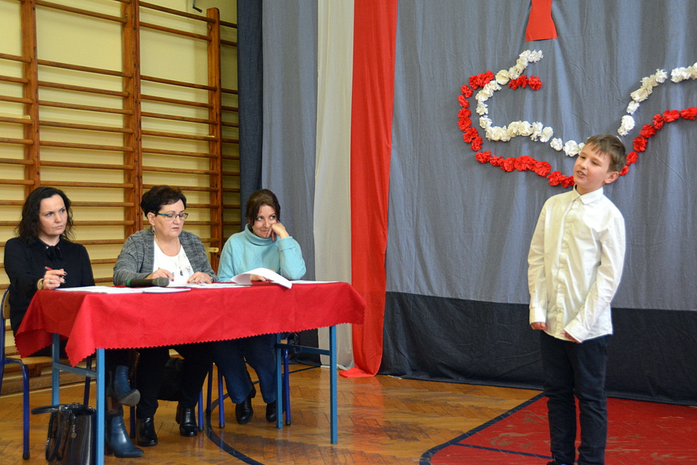 W pierwszej części konkursu uczniowie napisali test sprawdzający znajomość polskich legend, Mazurka Dąbrowskiego, „Kamieni na szaniec” oraz biografii Józefa Piłsudskiego. Po wyczerpującej pracy pisemnej przyszedł czas na chwilę przerwy, podczas której dzieci mogły poczęstować się pysznym pączkiem i sokiem ufundowanym przez Market Budowlany Śnieżka. W tym czasie komisja wyłoniła finałową dziesiątkę uczniów. W grupie wiekowej 5 i 6 klasy: Nadia Kita (50 pkt.), Gabriela Gibała (46 pkt.), Dominika Cholewa (43 pkt.), Gabriela Duda (43 pkt.), Julia Misina (40 pkt.). W grupie wiekowej 3 i 4 klasy: Kacper Starowicz (35 pkt.), Aleksandra Serwatka (34 pkt.), Julia Lis (30 pkt.), Maciej Żurek (29 pkt.), Maria Jurek (28 pkt.).