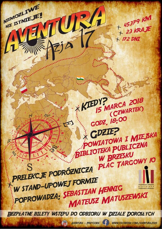 W czwartek, 15 marca w Powiatowej i Miejskiej Bibliotece Publicznej w Brzesku odbędzie się spotkanie autorskie z Sebastianem Hennigiem i Mateuszem Matuszewskim - twórcami projektu podróżniczego "Aventura". Młodzi podróżnicy opowiedzą o niezwykłej podróży autostopem z Polski do Chin. W programie również fotograficzna i filmowa relacja z podróży.