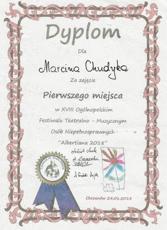 24 stycznia 2018 roku, w Chrzanowie odbył się drugi etap eliminacji regionalnych XVIII Ogólnopolskiego Festiwalu Twórczości Teatralno-Muzycznej Osób Niepełnosprawnych Intelektualnie Albertiana 2018. Wśród solistów pierwsze miejsce wyśpiewał podopieczny WTZ w Brzesku - Marcin Chudyka. Zaśpiewał piosenkę „Alleluja” – Leonarda Cohena w tłumaczeniu Macieja Zębatego.