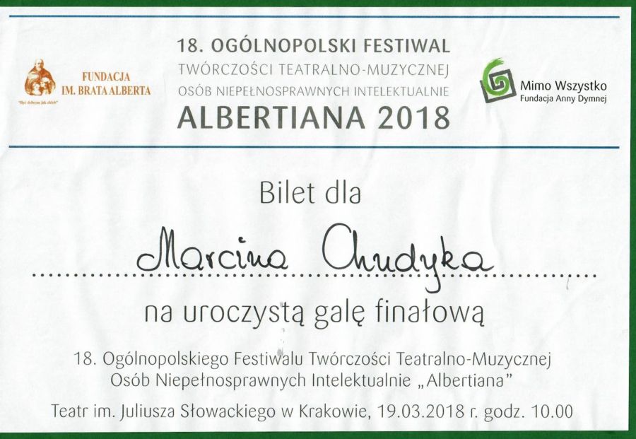 Marcin Chudyka jako zwycięzca z regionu obejmującego swoim zasięgiem województwa małopolskie, śląskie i opolskie ponownie zaśpiewał piosenkę „Alleluja” podczas finału „Albertiany”, który odbył się na dużej scenie teatru im. Juliusza Słowackiego w Krakowie, 19 marca. To wielki zaszczyt móc stanąć na scenie i odebrać gratulacje od samej Anny Dymnej. Występ Marcina został bardzo pozytywnie odebrany przez publiczność, która wraz z nim śpiewała refren piosenki. Na sukces złożyła się wielogodzinna praca muzykoterapeuty Andrzeja Gicali, który przygotowywał Marcina wokalnie i muzycznie, towarzyszył mu także podczas występu. Finał festiwalu prowadziła Anna Dymna, Lidia Jazgar oraz ks. Tadeusz Isakowicz-Zaleski. Na deskach dużej sceny swój repertuar zaprezentowało pięć zespołów teatralnych oraz pięciu solistów, którzy zajęli pierwsze miejsca w drugim etapie eliminacji regionalnych