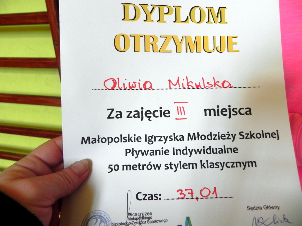 Zawody rozgrywane były w czterech kategoriach: 50 m stylem dowolnym, grzbietowym, klasycznym i motylkowym. Oliwia Mikulska płynęła na dystansie 50 m stylem klasycznym, w którym startowały 42 zawodniczki z roczników 2004, 2003 i 2002. Uczennica poprawiła swój poprzedni rezultat o 1,59 sekundy i zajęła trzecie miejsce. Sukces Oliwii jest tym większy, że była zawodniczką najmłodszego rocznika startującego w tej grupie dziewcząt.