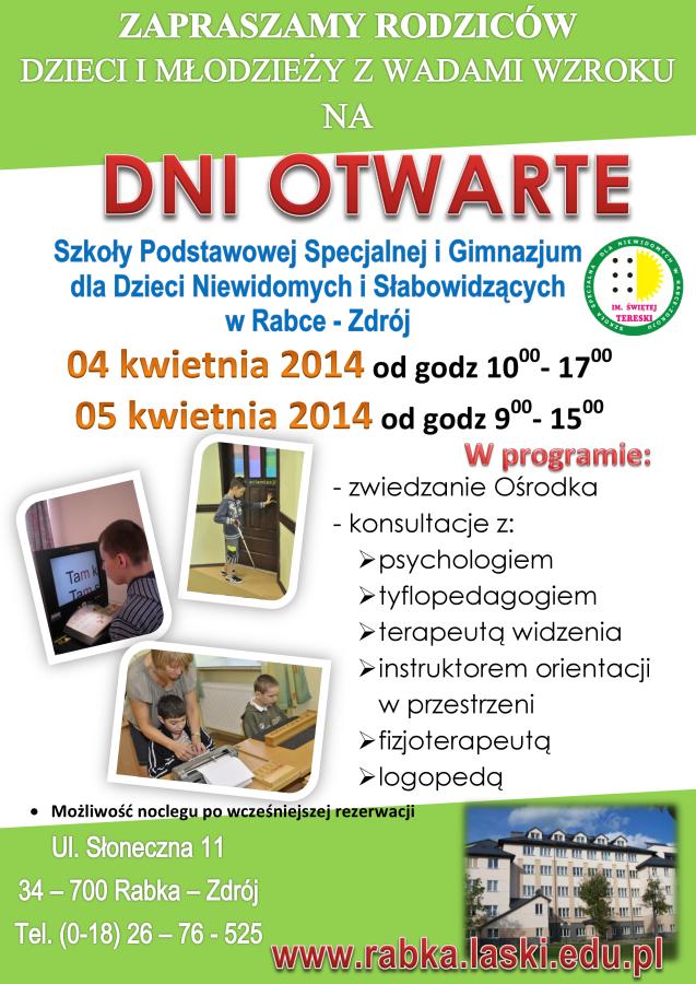 Podstawowa Specjalna i Gimnazjum dla Dzieci Niewidomych i Słabowidzących w Rabce-Zdroju przyjmuje dzieci z wadami wzroku: słabowidzące i niewidome - z upośledzeniem umysłowym, dodatkową niepełnosprawnością ruchową i zaburzeniami rozwoju. Szkoła zaprasza na dni otwarte w wszystkich zainteresowanych rodziców dzieci z wadami wzroku w dniach: 4. IV.2014 w godzinach od 10.00 do 17.00 i 5.IV.2014 w godzinach od 9.00 do 15.00. W programie możliwość zwiedzenia szkoły i internatu, konsultacje ze specjalistami w zakresie rehabilitacji wzroku, ruchu, orientacji przestrzennej, tyflopedagogiem.